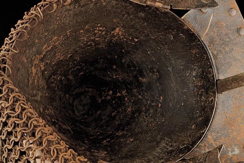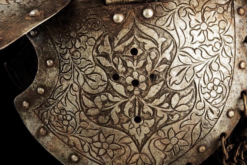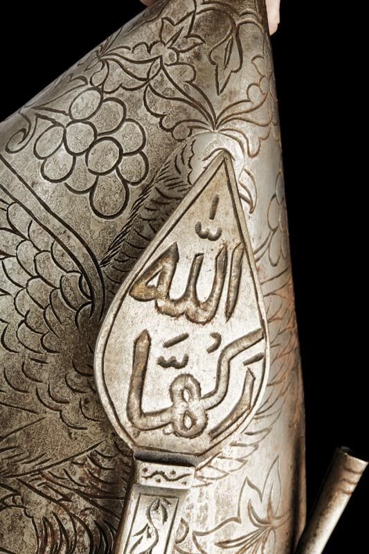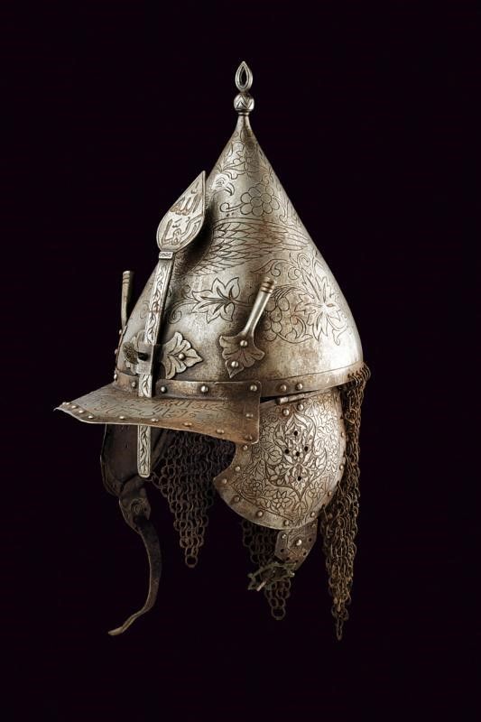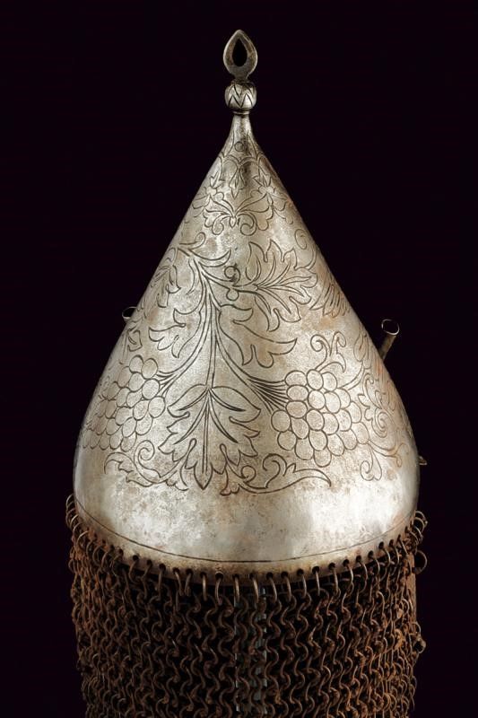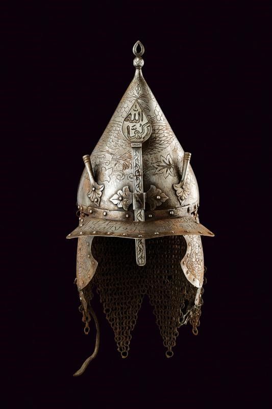 altezza 49 cm. 1900 circa Coppo appuntito, in ferro, lavorato in un unico pezzo; la superficie incisa con un volatile e a motivi floreali; sul lato frontale il nasale scorrevole, con incisioni in caratteri arabi, posto fra due pennacchiere. Visiera leggermente spiovente con iscrizioni in caratteri arabi. Orecchioni mobili, traforati ed incisi en suite. Il retro con camaglio a grandi anelli con chiusura rivettata.