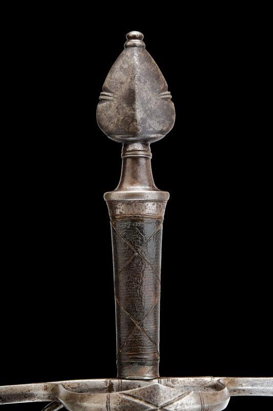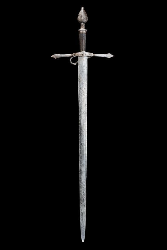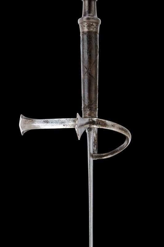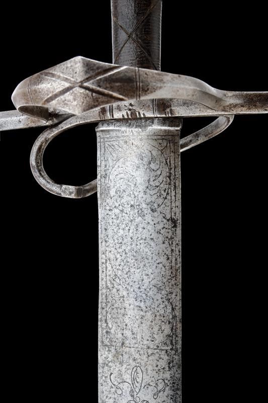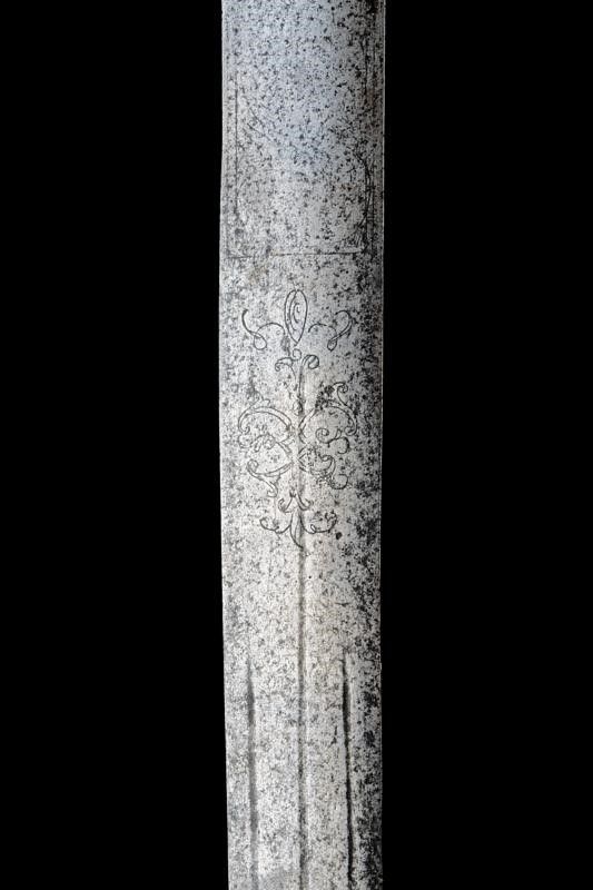 lunghezza 112 cm. Larga lama dritta a due fili di sezione lievemente lenticolare, la base con resti di incisioni floreali su entrambi i lati seguite da tre leggere scanalature. Fornimento in ferro con bracci dell'elso dritti, piatti ed allargati verso l'estremità. Grande anello di parata decorato con due linee incrociate al centro, sul retro un singolo archetto con ramo di raccordo all'elso. Bel pomo a foglia, costolato in mezzeria e con piccole scanalature sui lati, il collo liscio. Impugnatura in legno rivestita di cuoio.
