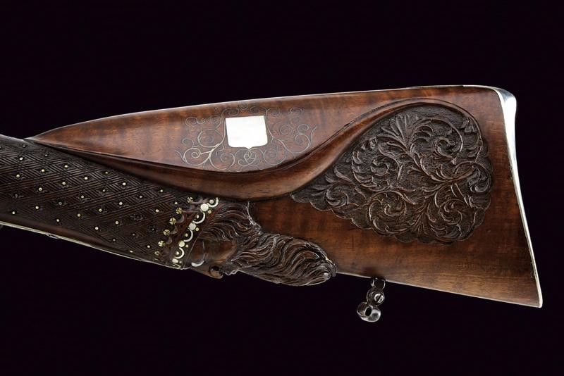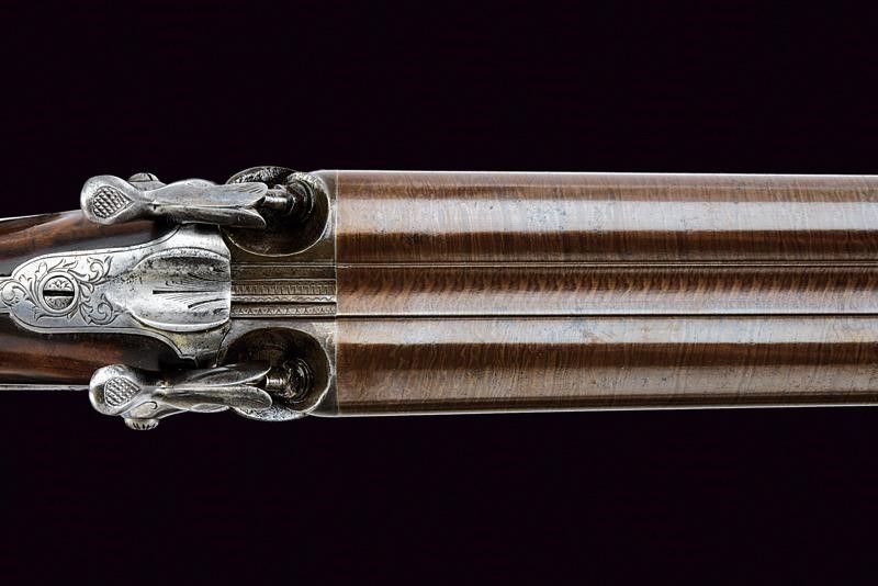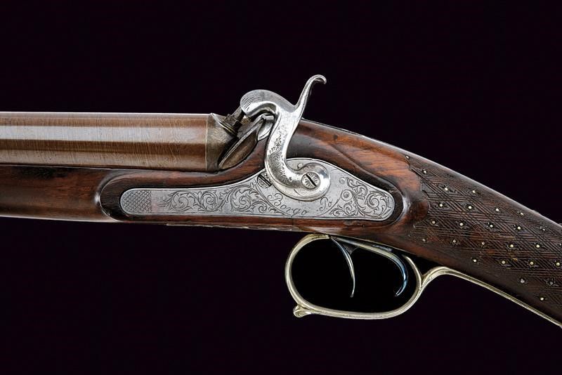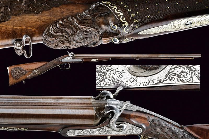 lunghezza 120.5 cm. Canne tonde, lisce (anime pulite), in damasco brunito, la bindella con mirino; cal. 21 mm. Il blocco di culatta finemente inciso tra i luminelli. Lunga codetta incisa a motivi floreali e munita di traguardo a sella. Batterie a molla in avanti marcate 'M Bruera' e 'Borgo Po', cartelle incise a motivi floreali e geometrici. Mezza cassa in legno con lungo collo zigrinato a losanghe e decorato chiodini in argento, la parte inferiore della pala scolpita con volto di uomo barbuto a avente occhi di vetro e corona in argento. Le guance decorate a racemi, quella di destra anche con cinghiale, quella sinistra con scudetto in argento fra decorazioni in filigrana. Fornimenti in argento decorati en suite con la batteria. Bacchetta in legno con cavastracci in ferro e battipalla in ottone.