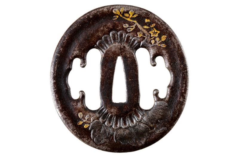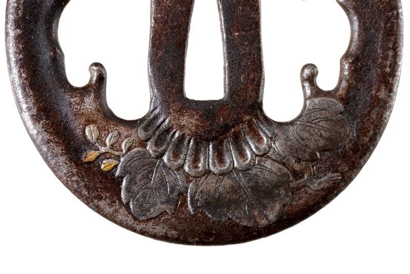 dimensioni 7.6 x 8.1 x 0.4 cm. Periodo Edo (1603-1867) In ferro, tate-maru-gata, con superficie ondulata verso il bordo a formare un leggero abbassamento in corrispondenza del mimi. La decorazione consta, verso l'alto, in un ramo di fiori di paulonia inciso e decorato in nunome d’oro, verso il basso in foglie di paulonia con nunome d’argento, il nakago-ana è incorniciato da sopra e sotto con petali di crisantemo.