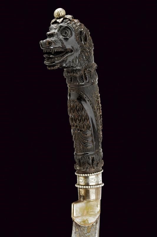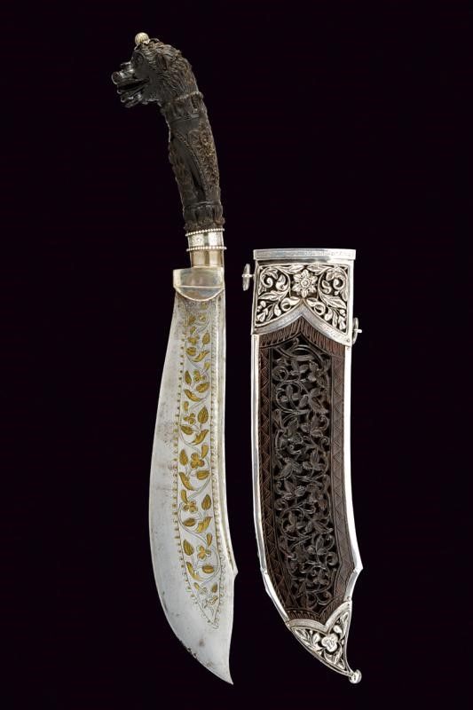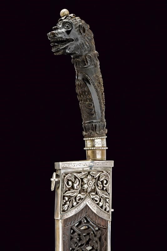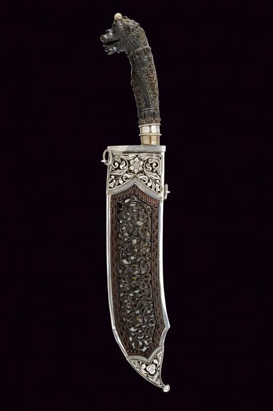 XIX Secolo Larga lama a un filo incurvato, con dorso scanalato e punta incavata; il lato di terza riccamente inciso a motivi floreali rimessi in ottone, quello di quarta inciso a motivi floreali con cornice a onde, il tallone rivestito in ottone argentato. Impugnatura in corno marrone maestosamente scolpita a motivi floreali e con pomo a testa di drago a tuttotondo, il bottone sferico inciso a raggi e posato su foglie in argento. Fodero composto da due piastre in corno rivettate assieme, quella anteriore riccamente traforata a motivi floreali, quella posteriore incisa a motivi geometrici, bellissimi fornimenti in argento parzialmente sbalzati, traforati ed incisi; due anelli di sospensione. Nella sua scatola di presentazione originale in legno con fornimenti in argento (in patina scura), incisi e traforati a motivi floreali. Serratura con scudetto (chiave mancante); l'interno foderato in seta celeste.