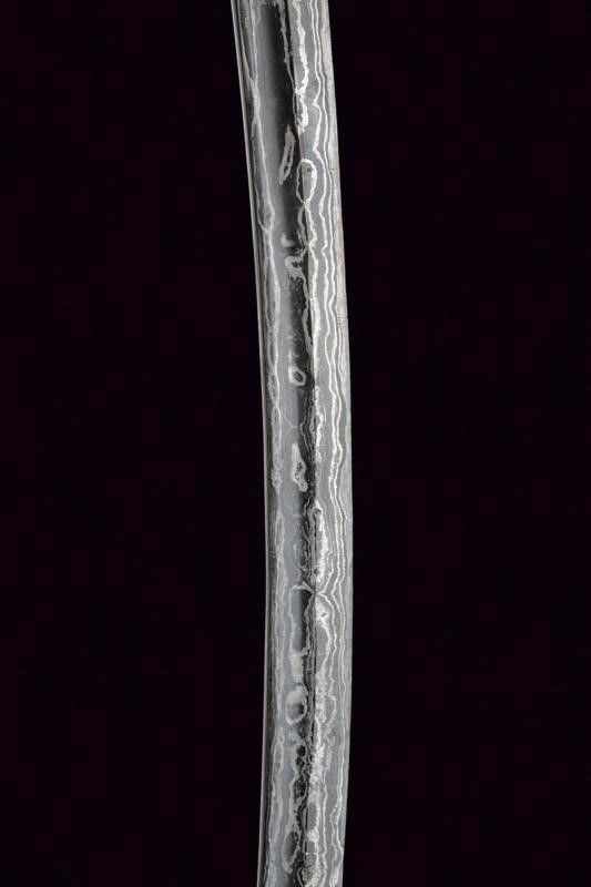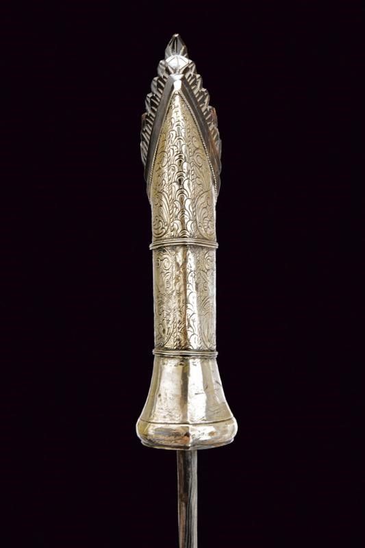 Sumatra, lunghezza 66 cm. XIX Secolo Robusta lama curva a un filo, in finissimo pamor con sguscio accanto al dorso. Tipica impugnatura, con grande pomo in corno intagliato e traforato, rivestita con lamina d'argento incisa a motivi floreali. Il fodero in legno completamente rivestito da lamina d'argento con incisioni alla cappa e quattro anellature in rilievo.