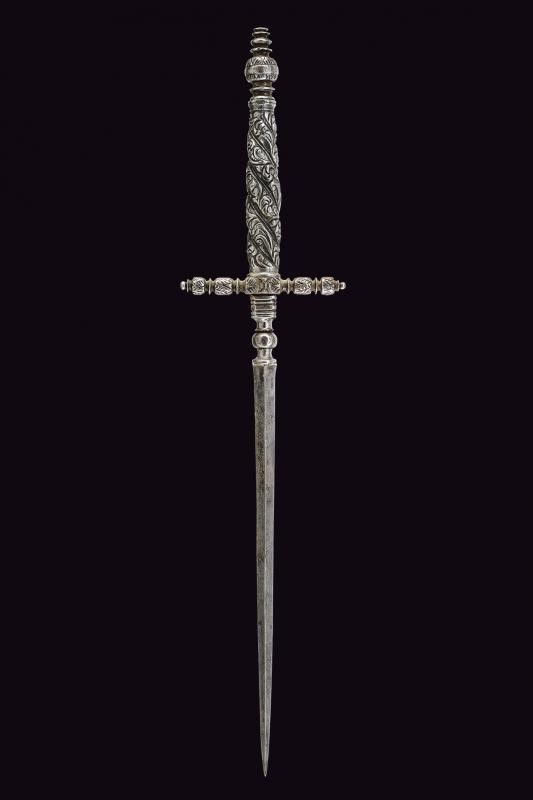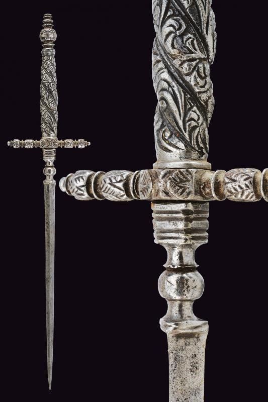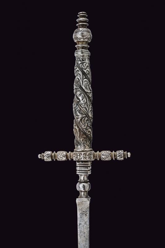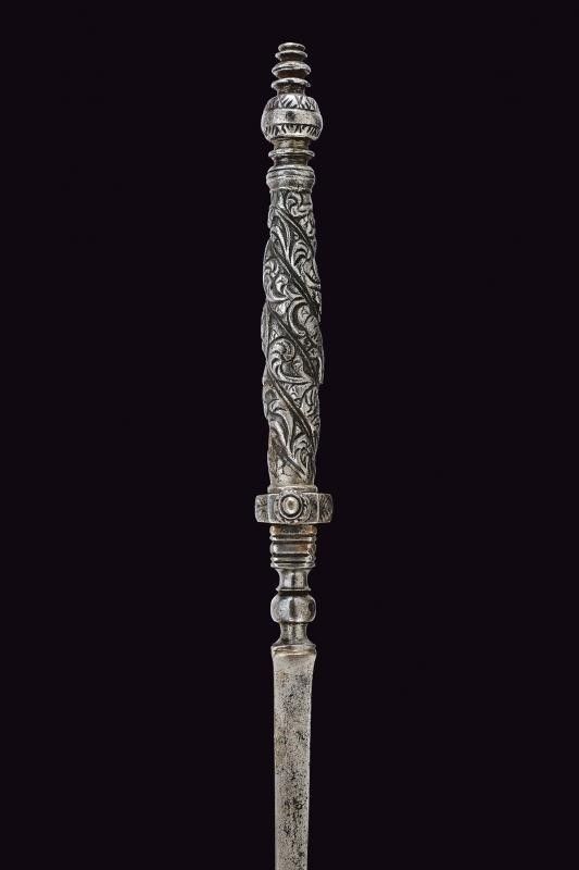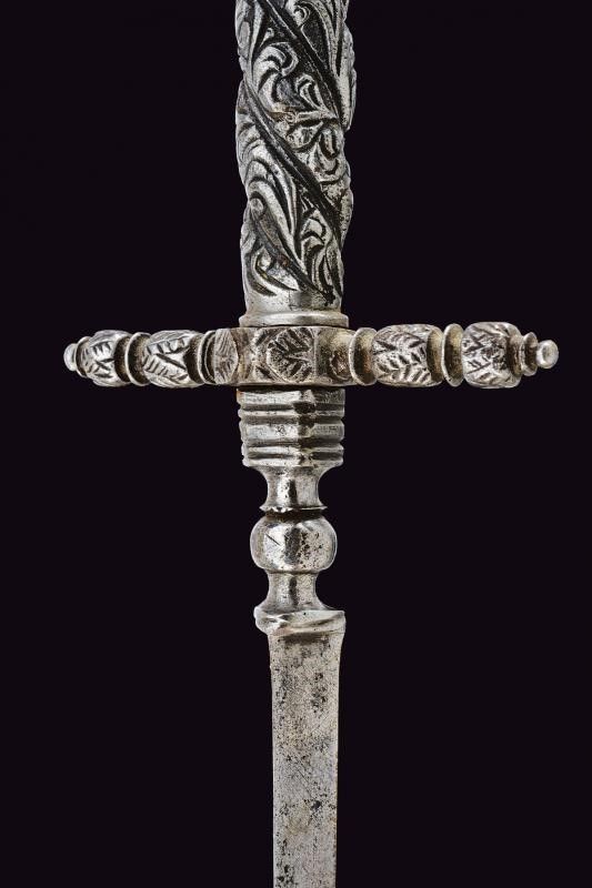 Lama dritta di sezione triangolare con nodo intagliato. Fornimento in ferro massiccio riccamente intagliato a motivi floreali.