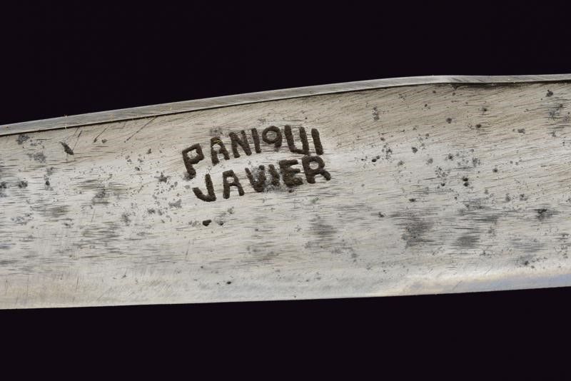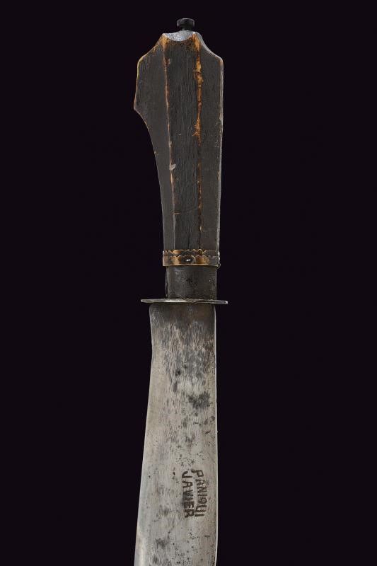 Luzon, lunghezza 39 cm. Fine del XIX Secolo Larga lama leggermente curva, a un filo, con zone danneggiate dalla ruggine, recante su un lato marcatura 'PANIOUI / JAVIER'. Impugnatura in legno faccettato con ghiera in rame. Fodero in legno (mancanza) con fornimenti e rivestimento in filo di rame; su un lato sei piccoli pendenti con placche in madreperla. Molto raro.
