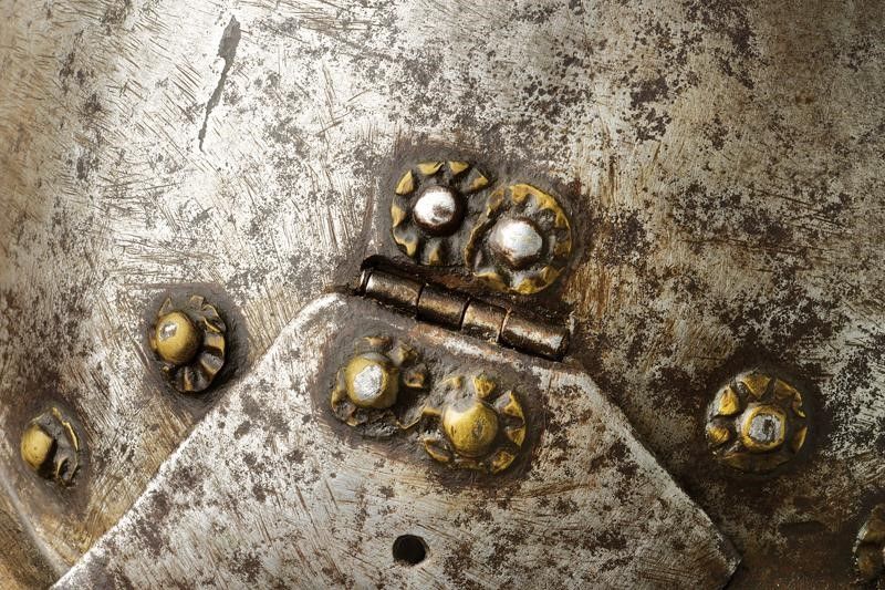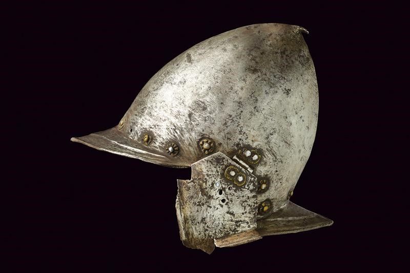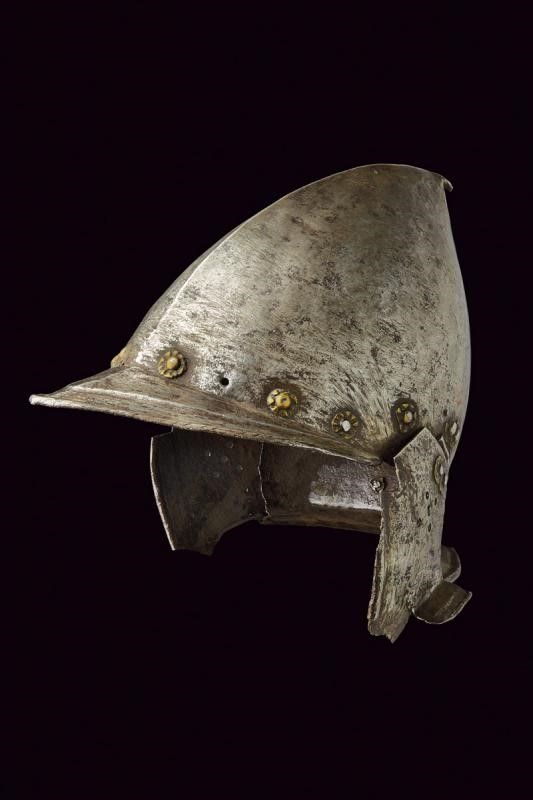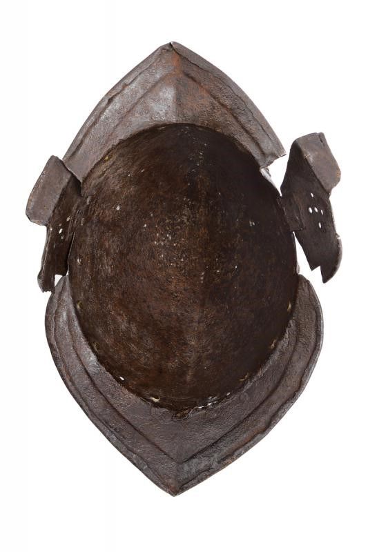 altezza 25 cm. Coppo in ferro lavorato in un unico pezzo, costolato al centro e con apice incurvato, dotato di giro di ribattini muniti di rosetta in ottone (una mancante). Tesa a lista ribassata e con bordo orlato en suite con la gronda. Orecchioni mobili. Piccole mancanze a uno dei due orecchioni e un restauro alla tesa.