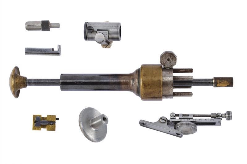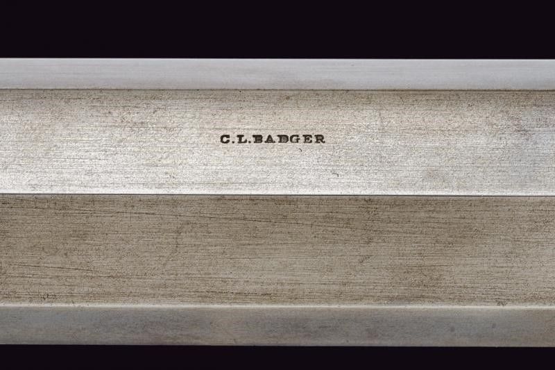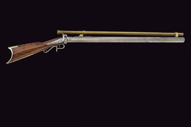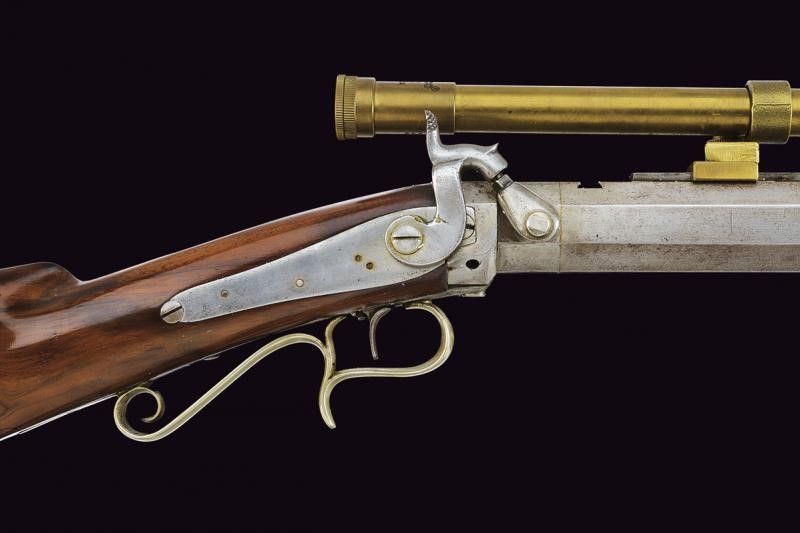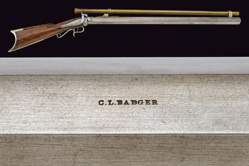 Metà del XIX Secolo Pesantissima canna ottagonale rigata, dotata in volata di sforature per montaggio di un avviatore, con scassi per innesto di mirino e alzo e dotata (successivamente?) di una guida a scorrimento per montaggio di un'ottica. Cal. 43 in volata. Sul lato sinistro la firma 'C.L. BADGER'. Il codolo dorsale con diverse sforature per montaggio di una diottra. Batteria a molla indietro con meccanica funzionante, il cane forse con un'antica riparazione. Bel calcio in radica. Grilletto con vite di regolazione. Ponticello e calciolo in metallo bianco. La carabina è dotata di svariati accessori: una lunga ottica in ottone, attualmente montata, realizzata ad imitazione dei primi cannocchiali da fucile (produzione del tardo XX secolo); mirino a tunnel, alzo e diottra, di produzione più tarda ma realizzati come gli originali del tempo. Infine è completa del suo avviatore antico. Interessante.