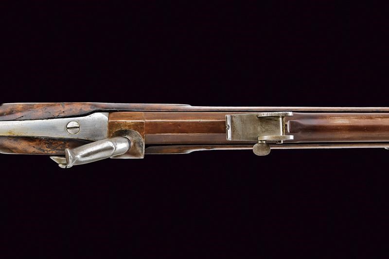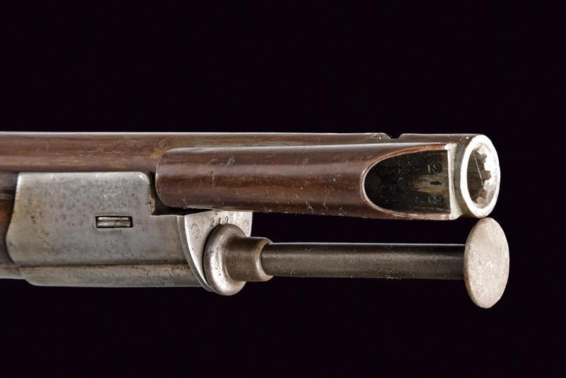 lunghezza 125.5 cm. Canna rigata (rigatura ben visibile), ribrunita, tonda, con culatta ottagonale, dotata di alzo regolabile, mirino mancante e munita di attacco per la baionetta, cal. 10 mm; lunga codetta liscia. Batteria a luminello a molla in avanti con cartella piatta. Cassa intera in legno (segni d'uso e del tempo). Fornimenti e bacchetta in ferro, ponticello con poggiadito. Stecher.