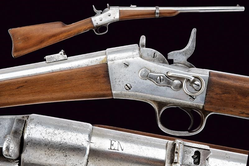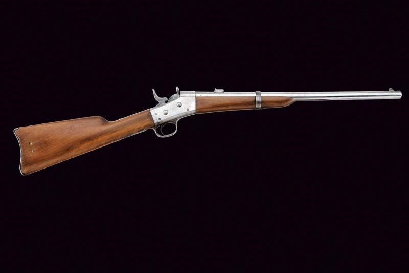 USA, lunghezza 90.5 cm. 1888 circa Canna tonda rigata, marcata 'EN' con alzo regolabile e mirino, cal. 11 mm. Castello con meccanica a blocco rotante funzionante. Codolo superiore con marcatura della Remington e brevetti fino al 1888. Anello da sella. Calcio ed astina in legno liscio, fornimenti in ferro.