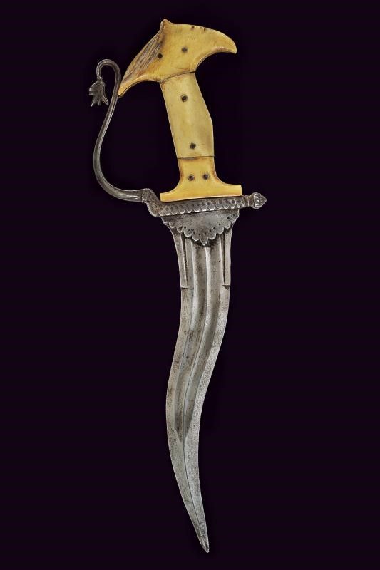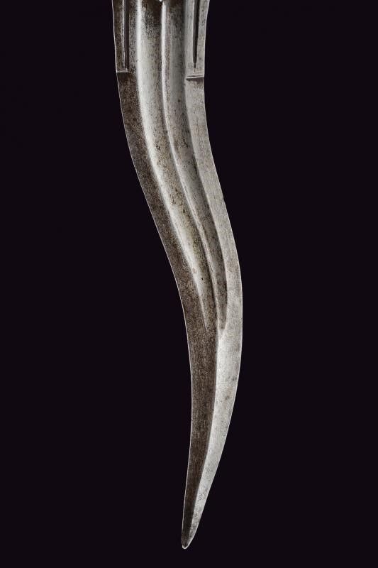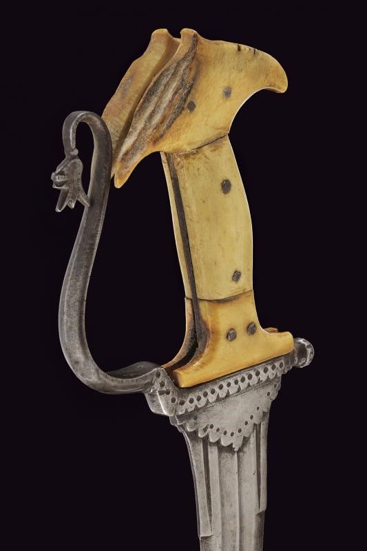 lunghezza 33.8 cm. Fine XVII - Inizio XVIII Sec. Lama controcurvata a due fili, con punta rinforzata e costolata, duplice sguscio e due scanalature laterali al tallone. La base con lunghe placche che fermano la lama e con bordo ondulato. Fornimento in ferro con massello decorato en suite, cortissimo braccio di parata intagliato a pigna, guardia costolata con estremità superiore incurvata e culminante a foglia. Guancette in corno di cervo di forma tipica, in tre pezzi, con rivetti in ferro.