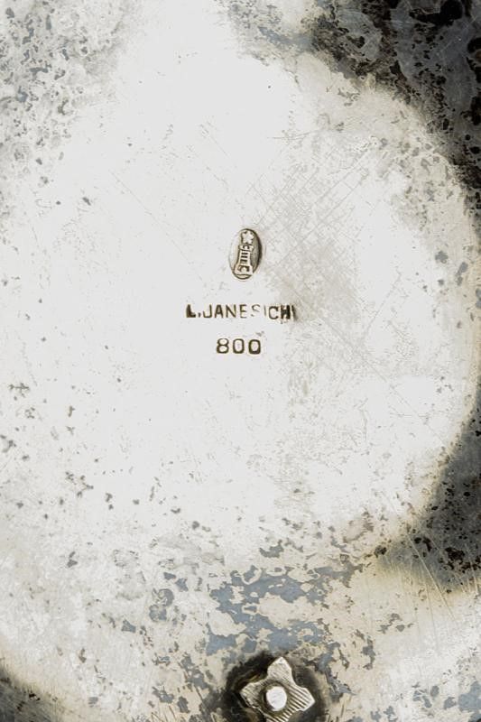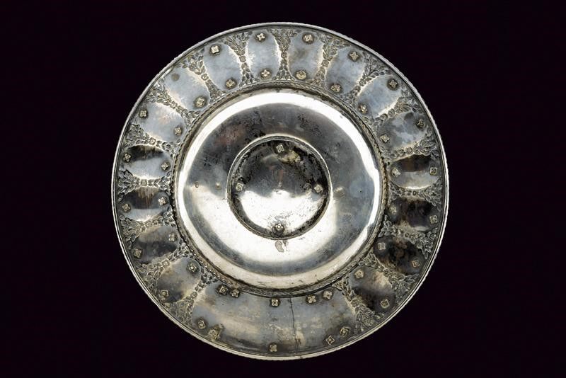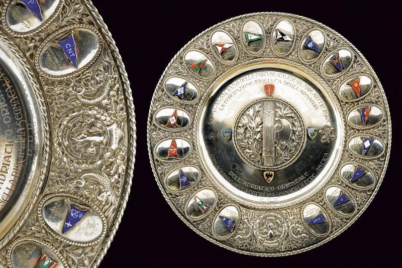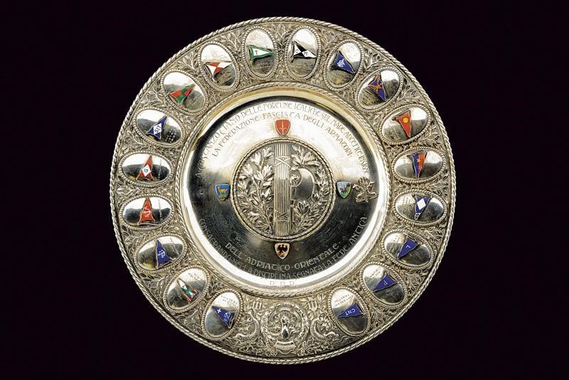 diametro 33.5 cm. 1926 Bellissimo piatto in argento, di forma circolare, rialzato al centro e decorato con un fascio tra fronde di alloro sbalzate. Nello specchio dedica 'A COSTANZO CIANO DELLE FORTUNE ITALICHE SUL MARE ARTEFICE INSEGNE CONSACRANDO NELLA DISCIPLINA SEGNATA LA FEDE ANTICA - LA FEDERAZIONE FASCISTA DEGLI ARMATORI DELL'ADRIATICO ORIENTALE - D.D.D. TRISTE XIV AGOSTO MCMXXVI'. Ai punti cardinali del fregio centrale quattro scudetti smaltati in policromia, vicino a quello posto a destra anche due delfini suddivisi da un tridente (il fregio sinistra mancante). Il bordo decorato con diciotto medaglioni, ognuno dei quali con un gagliardetto smaltato in policromia; tutti i gagliardetti differenti e con iscrizione della società navale. Nella parte inferiore corona di alloro recante un braccio intento a stringere fronde di quercia con il famoso motto di Gabriele D'Annunzio 'MEMENTO AUDERE SEMPER', al di sotto 'BUCCARI 10 II 1918', il serto posto tra due delfini con tridente. Sul retro nome del fabbricante 'L. JANESICH', punzone e timbro '800'.