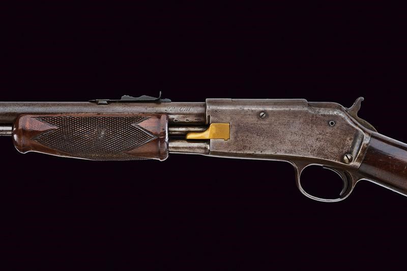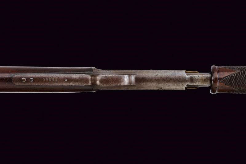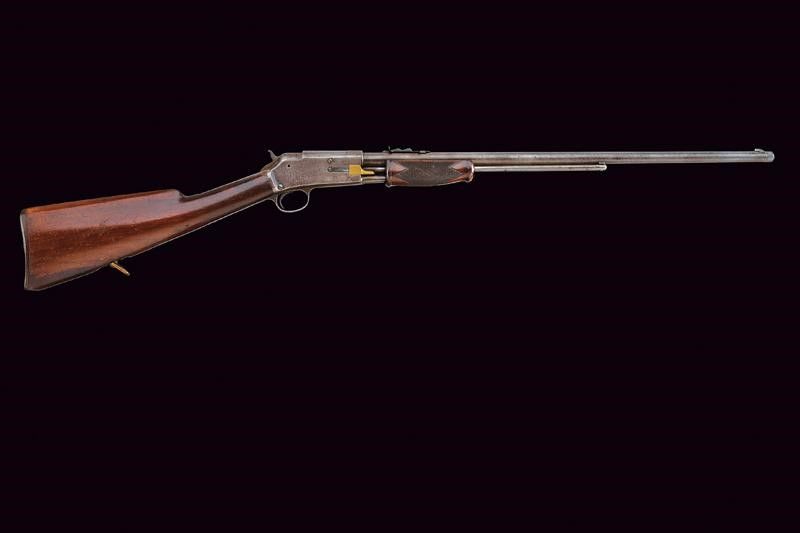 1887 Canna tonda rigata, da 24', dotata sezione svitabile zigrinata in volata che rivela una filettatura, recante marcatura della Colt in due righe con indirizzo di Hartford e brevetti dall'83 all'87, munita di mirino e alzo regolabile, cal. 22, con dicitura alla culatta. Anima da pulire, rigatura visibile. Castello in ferro. Meccanica funzionante. Il codolo inferiore con matricola '133xx'. Quello superiore con sforatura per inserimento di una diottra (non presente). Calcio e astina in legno di noce, la seconda zigrinata. Calciolo in gommadura con cavallino della Colt. Una sola campanella sotto alla pala, in ottone.