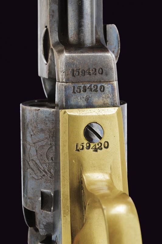 1859 Canna da 5' ottagonale, con mirino tondeggiante in ottone, marcatura in due righe 'ADDRESS SAM.L COLT / NEW YORK CITY' tra parentesi graffe, Cal. 31. Anima pulita, rigatura visibile. Tamburo a sei colpi con scena di attacco alla diligenza ben visibile, marcatura 'COLTS PATENT'. Castello con marcatura 'COLTS PATENT'. Matricola '159xxx' coeva su canna, fermo (parziale), castello, bande impugnatura, tamburo e perno (parziale). Bande in ottone. Impugnatura in noce. Meccanica ben funzionante. Molto ben conservata, con resti dell'antica brunitura, soprattutto al tamburo, e della tartarugatura.