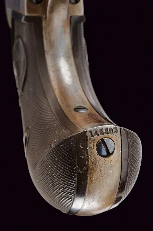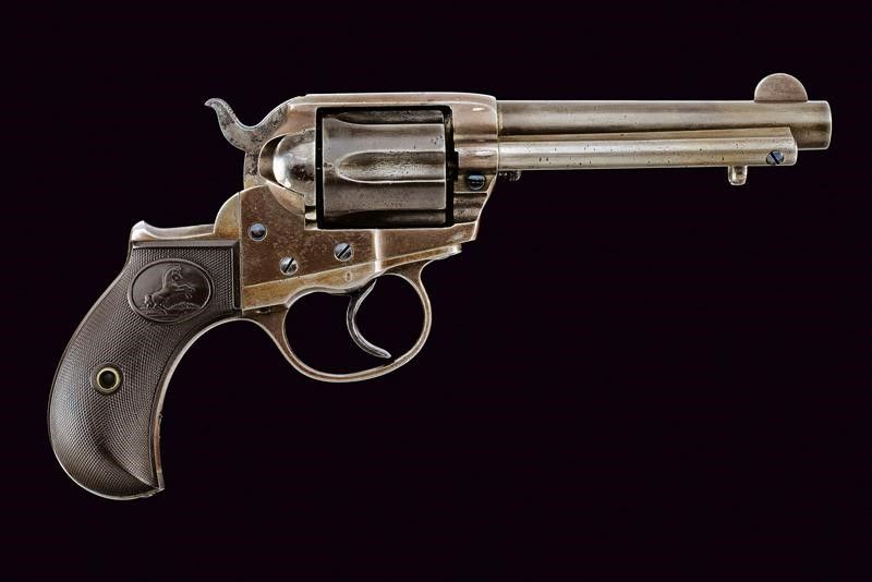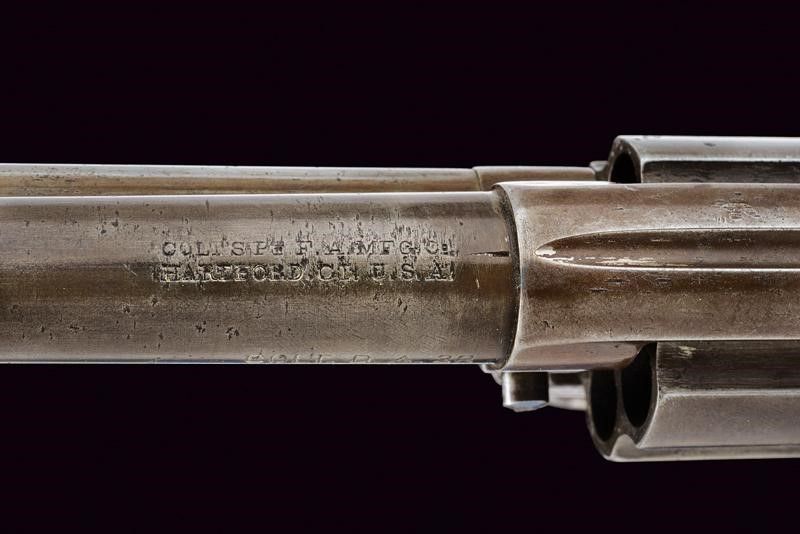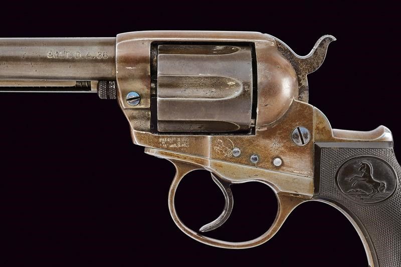 USA, lunghezza 24 cm. 1885 circa Canna rigata, tonda, recante indirizzo della ditta e marcatura 'COLT D. A. 38', dotata di mirino. Anima con lievissime intaccature e da pulire, rigatura visibile. Tamburo scanalato a sei colpi, castello con brevetti del 1871-1875, meccanica funzionante; guancette in legno zigrinate; matricola '145xxx'.
