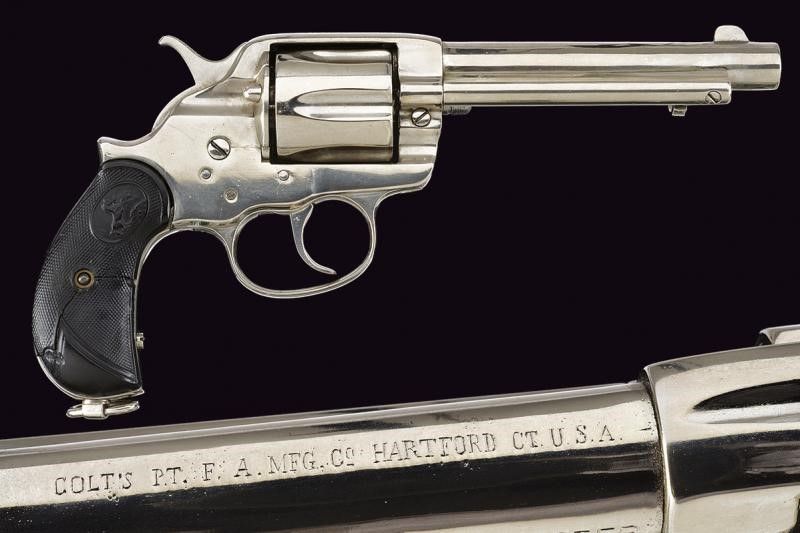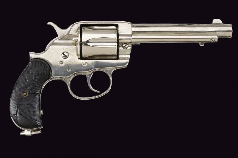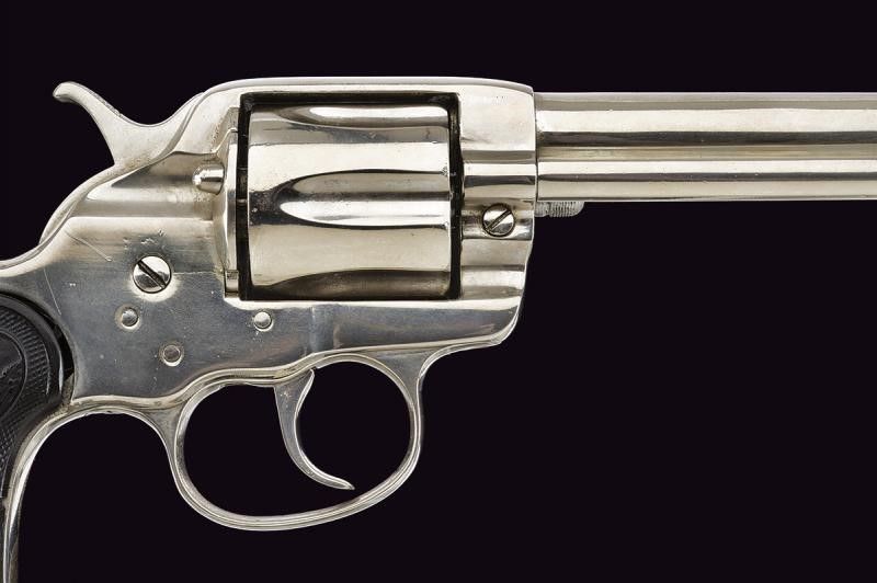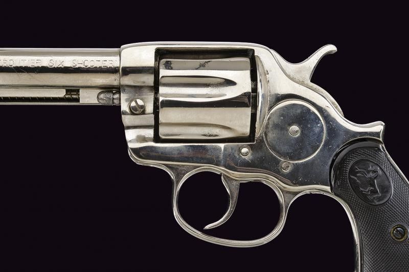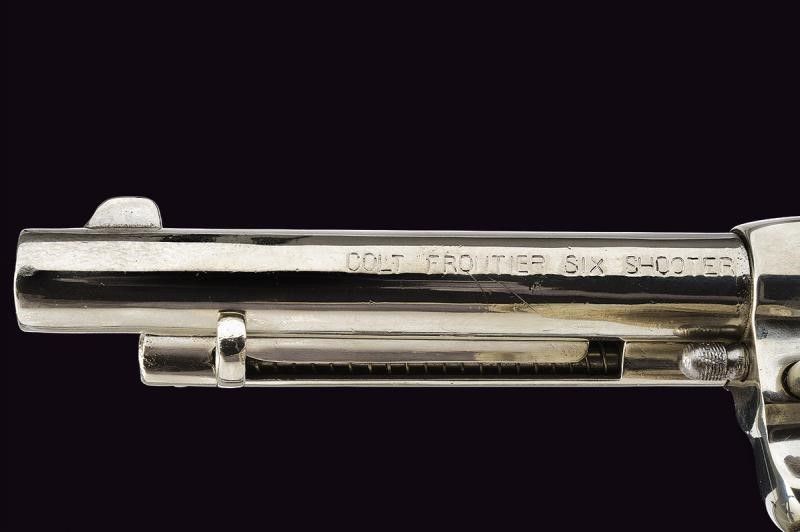 USA, lunghezza 27,5 cm. 1878 Canna tonda rigata da 5-1/2', con marcatura recante indirizzo della Colt al dorso in una riga e 'COLT FRONTIER SIX SHOOTER' sul fianco. Cal. 44-40. Anima pulita, rigatura visibile, intaccature e segni d'uso all'interno. Tamburo a sei colpi. Meccanica funzionante ma da rivedere (problemi a rotazione e blocco tamburo). Impugnatura con guancette in gommadura zigrinata e con cavallino in rilievo, una con crepe e piccoli danni. Matr. '37xxx'. Finitura nichelata probabilmente successiva. Anello porta correggiolo.