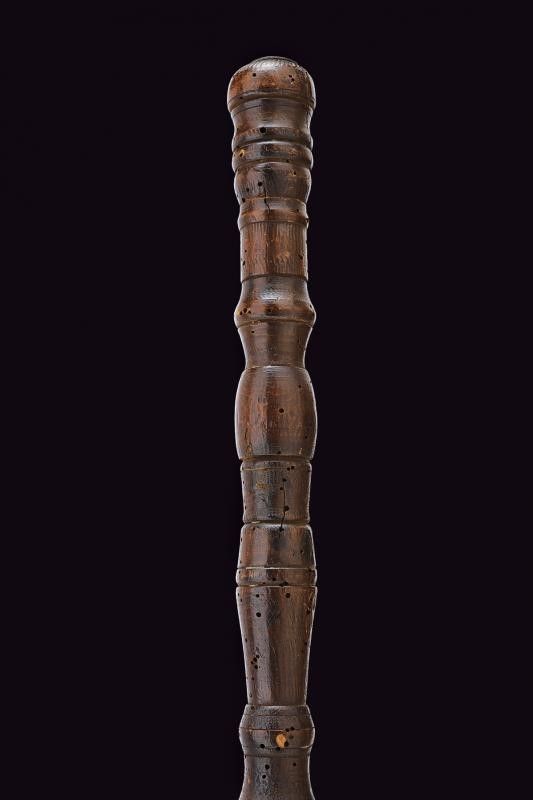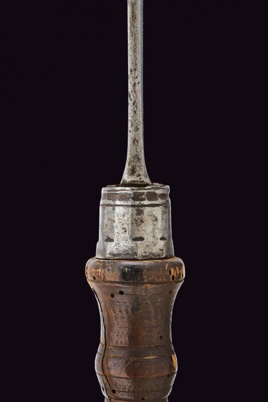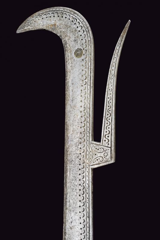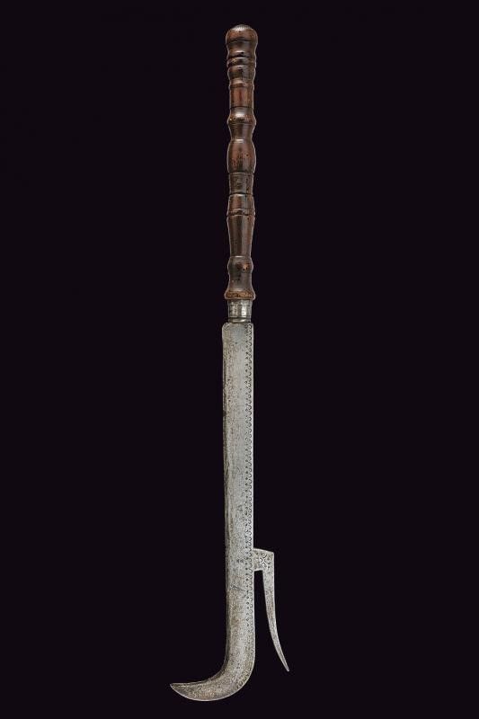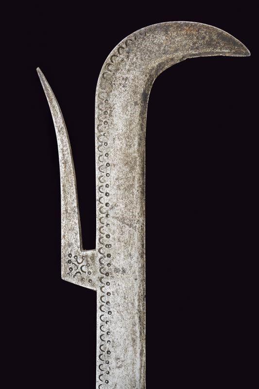 lunghezza 87.5 cm. Lunga lama a un filo con punta incurvata, al dorso nasce un lungo arresto leggermente controcurvato rispetto alla lama; per tutta la lunghezza e su entrambe le facce decorazioni con piccole mezzelune e puntini; vicino al debole profonda marca 'AP' sotto croce. Montata su un antico manico in legno tornito (danni da tarlo), gorbia in ferro. Interessante.