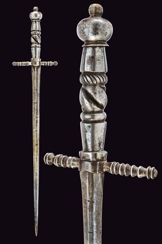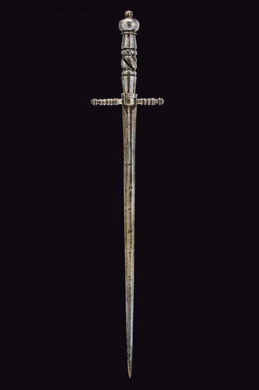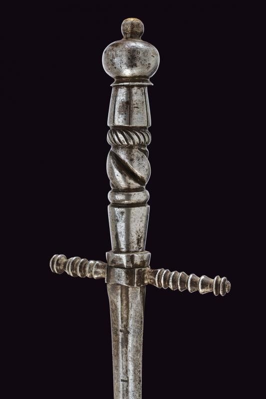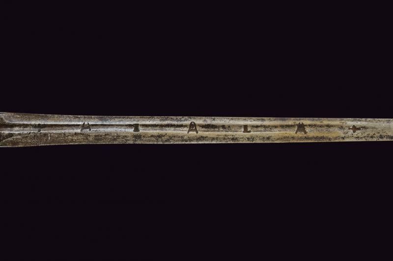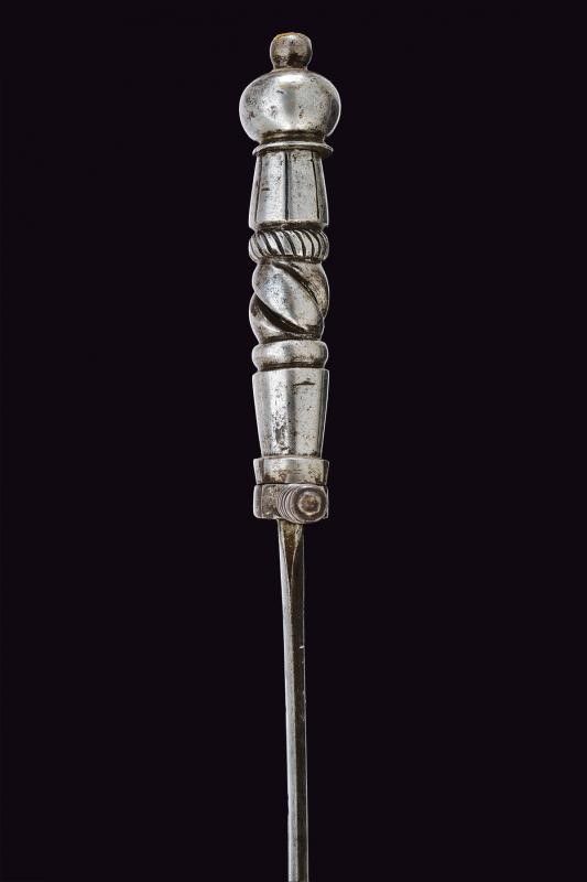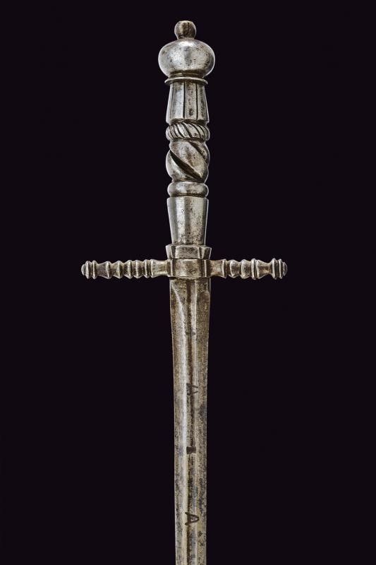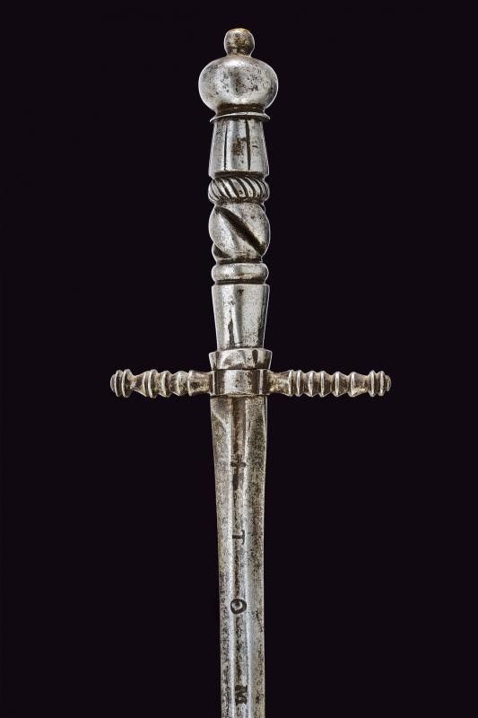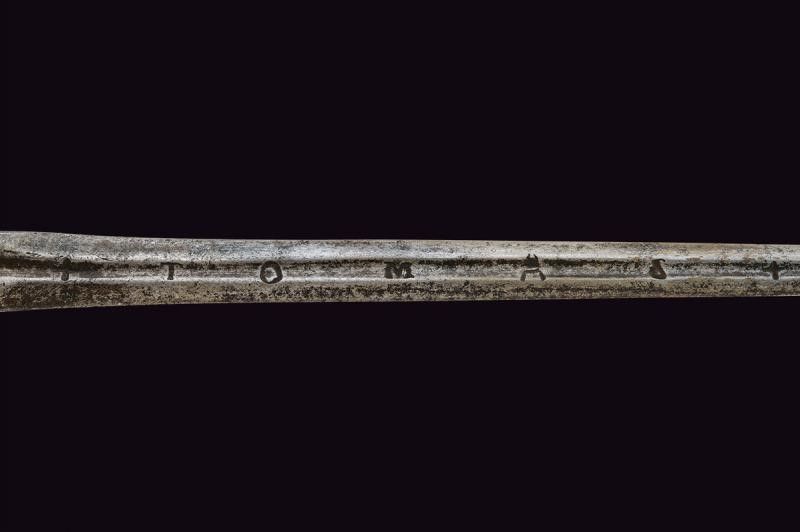 Lama dritta a due fili, probabilmente ricavata da uno spadino, con scanalatura alla base e firma 'TOMAS AIALA'. Bel fornimento in ferro massiccio intagliato a balaustro e con pomo sferico schiacciato.