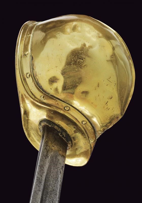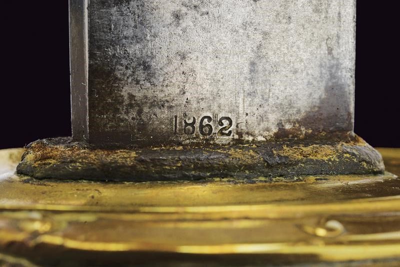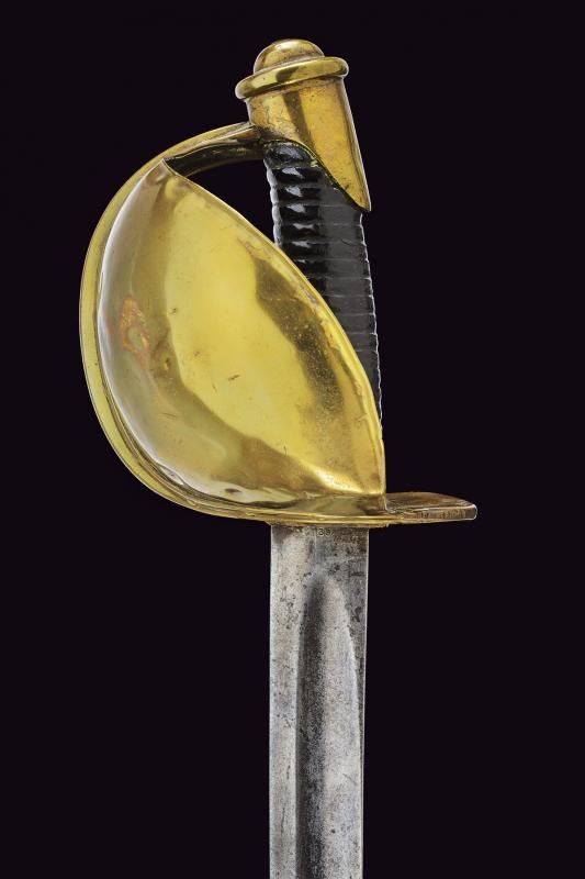 USA, lunghezza 81 cm. Terzo quarto del XIX Secolo Lama curva sgusciata a un filo e breve controfilo, con intaccature, datata alla base '1862' e con tracce di altre marcature quasi completamente svanite leggibile solo 'AMES / CHIC...' Fornimento in ottone con ampia guardia. All'interno la marcatura '9M / 455'. Impugnatura con rivestimento in cuoio nero. Fodero in cuoio con fornimenti in ottone. Il puntale con vela punzonata 'MA'.