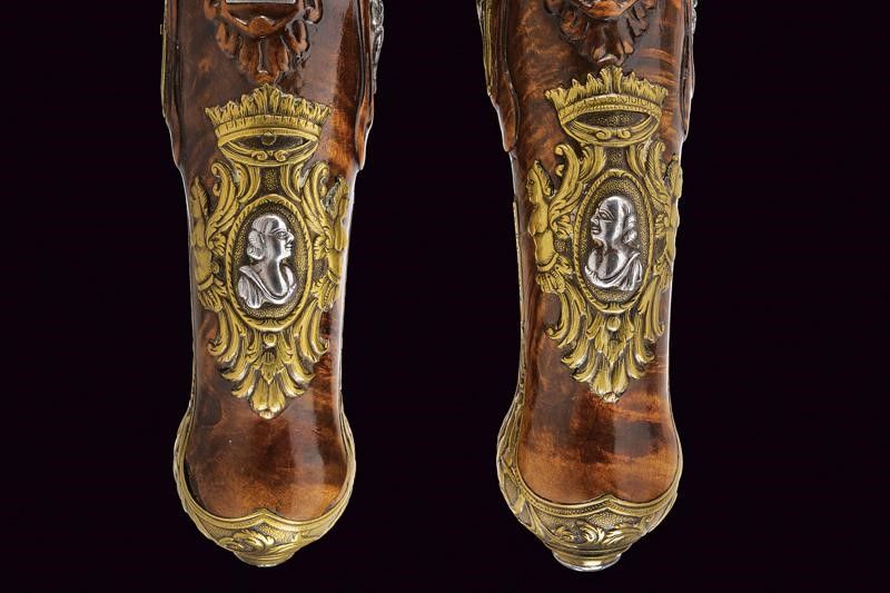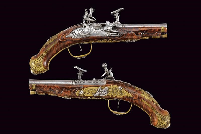 lunghezza 25.5 cm. Canne lisce a due ordini, ottagonali nella prima parte ed incisa a motivi floreali su fondo granulato, poi di sezione tonda con anellature al cambio, cal. 11 mm. Codette incise. Belle batterie alla fiorentina incise a motivi floreali, le code intagliate con busti di figure muliebri nude; cani e martelline intagliati ed incisi a motivi floreali, teste delle viti a mascheroni, copriscodellini scorrevoli. Casse intere in fine radica, leggermente scolpite e dotate di elegantissimi fornimenti in ottone decorati con figure muliebri (alcune alate) e a motivi floreali in bassorilievo, alcuni fornimenti anche decorati con busti e figure muliebri in ferro intagliato; le cocce con mascherone. Bacchette in legno con battipalla in ottone e cavastracci in ferro.
