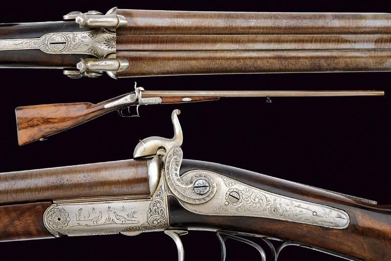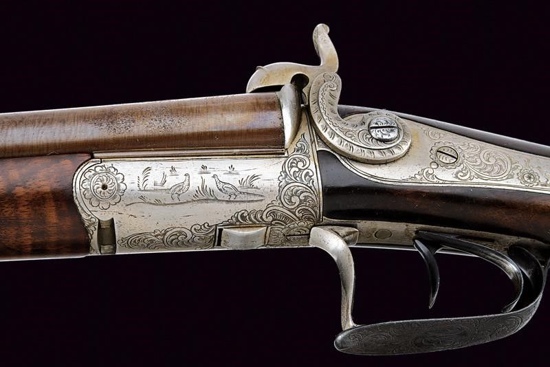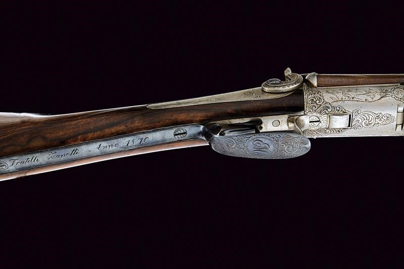 lunghezza 121,4 cm. Canne tonde lisce, in damasco, dotate di bindella, cal. 16. Anime pulite, con qualche intaccatura all'interno. Batterie a molla indietro con fini incisioni effigianti fiorami e fagiani. Meccanica funzionante. La bascula con incisioni en suite, presenti anche al codolo (la cui vite non tiene). Calcio ed astina in bella radica marezzata. Il ponticello funge anche da sblocco della chiave, ornato con monogramma 'EM'; il suo codolo firmato e datato 'Fratelli Zanotti 1870'. Tracce di brunitura. Calciolo e altri fornimenti in ferro.