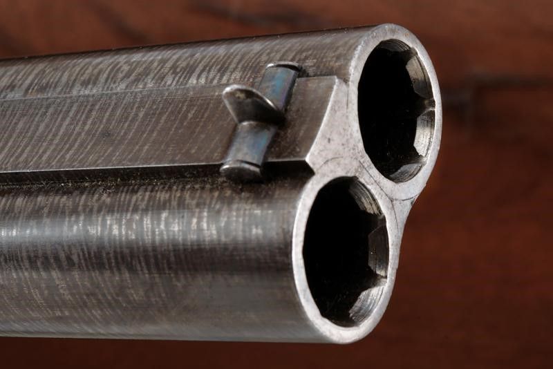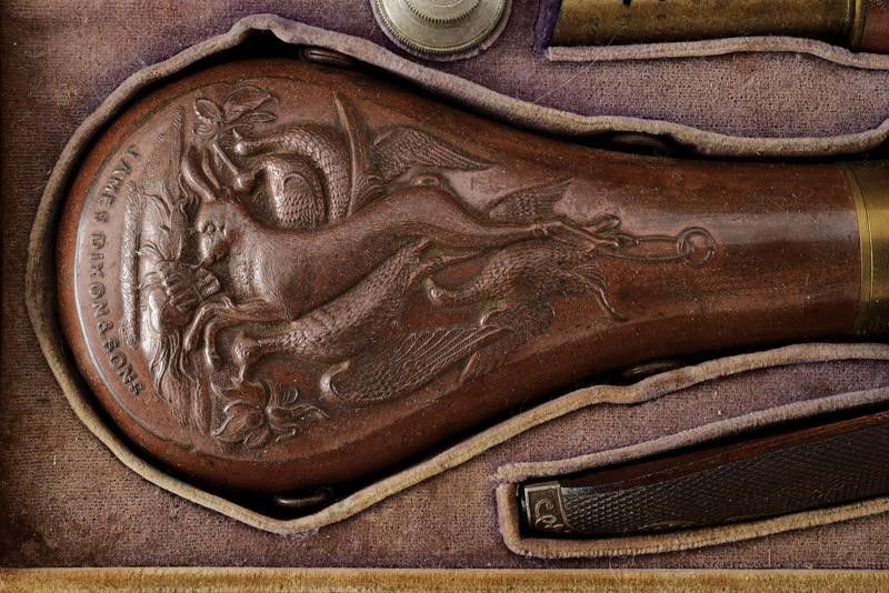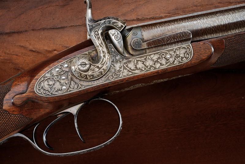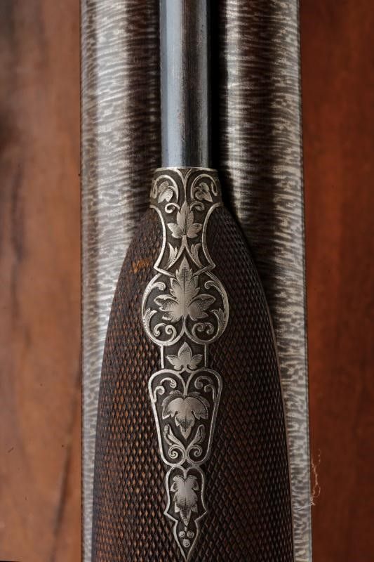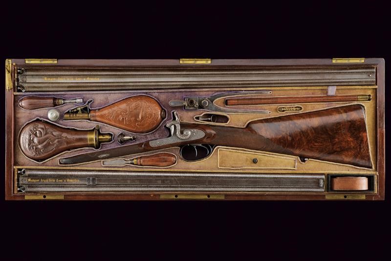 Un paio di canne rigate, tonde, damascate, con bindella marcata 'Mangeot Arq.er de la Cour a Bruxelles' in oro, incisioni a foglie alla base, mirino, bacchetta in ferro con battipalla in ottone, cal. 15 mm (lungh 65 cm). Un paio di canne lisce, decorate nello stesso modo, con bacchetta di legno, battipalla in ottone e cavastracci in ferro, cal. 18 mm (lungh. 76 cm). Larga codetta incisa con effige di Bacco (Bachus) tra foglie. Batterie a molla in avanti, finemente incise a fogliame in bassorilievo e firmate en suite attorno ai cani. Bellissima mezza cassa in radica, microzigrinata al collo e al poggiamano; fornimenti in ferro decorati en suite. Sul collo uno scudetto con monogramma 'AM'. Nella sua cassetta originale in legno foderata di velluto bordeaux, completa di tutti i suoi attrezzi quali la bella fiasca da polvere, la fiaschetta per i pallini, il cacciavite, lo svitaluminelli, il fondipalle ed altro.