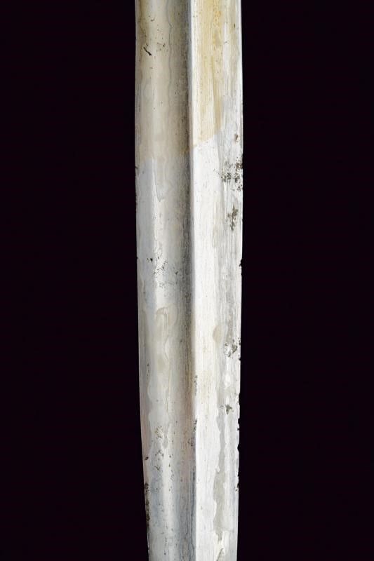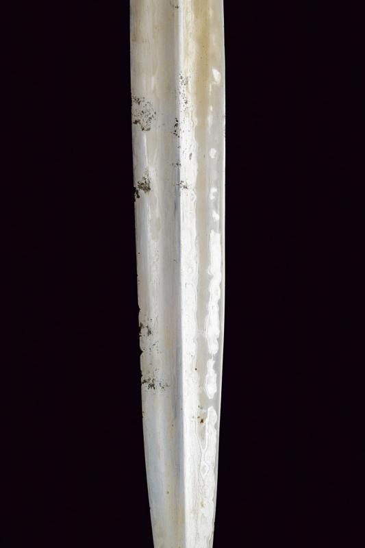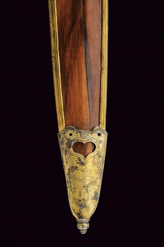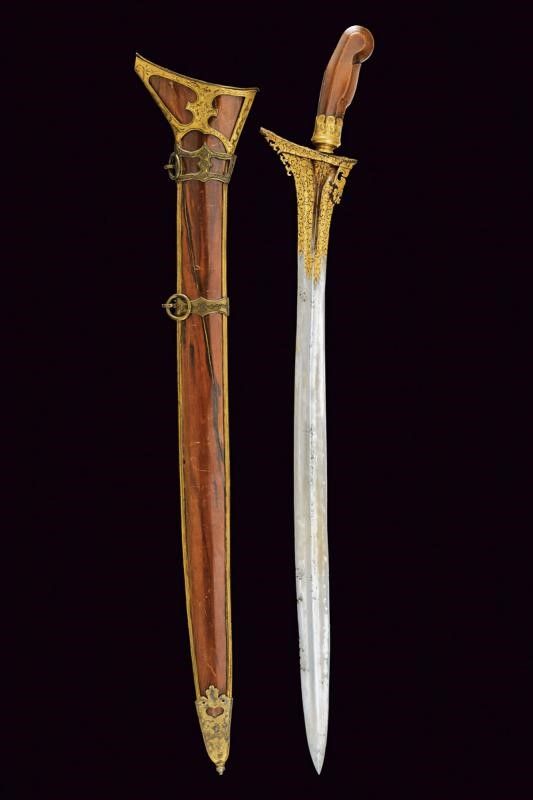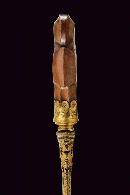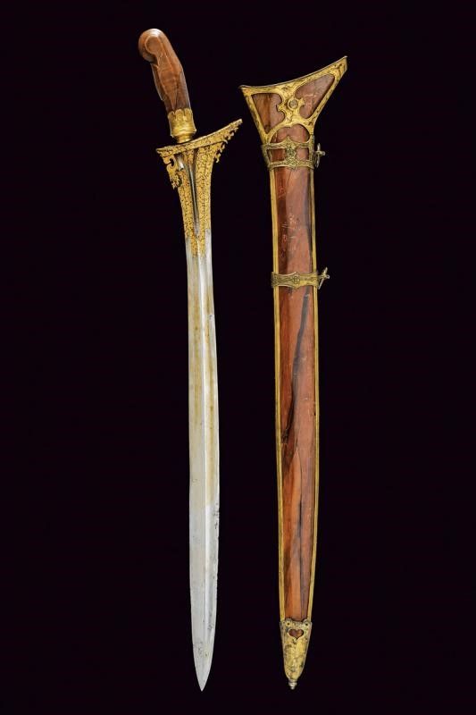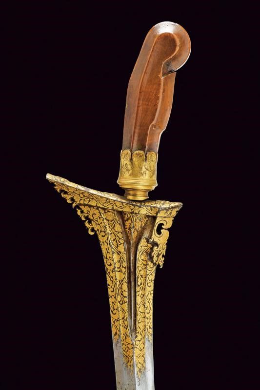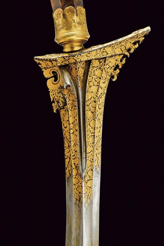 XVI Sec. La lama presenta decorazioni in oro alla base (kinatah emas) in stile del loto e un 'panji penganten' che perfora il gandik. È lunga, dritta e in ottime condizioni. La forma piuttosto lunga e snella ricorda un po' i kris di Sumatra, in particolare quelli delle regioni di Padang e Riau nel centro dell'isola. Anche i greneng (piccoli uncini e denti sul lato sporgente della base) sono insoliti e non tipici giavanesi, ricordano anche i lavori di Sumatra/Malesia. Nel sud di Sumatra si trovavano le similitudini più importanti di Majapahit, il regno giavanese orientale che governò per secoli sull'arcipelago (XIII-XVI secolo). Anche l'impugnatura, originale, contemporanea alla lama, è una rarità, ha la forma degli antichi 'tunggak semi' di Giava, la 'Durga nascosta' con simbolismo Tantrico-Shivaitico. La tipologia di questa impugnatura è comune nei primi kris da noi conosciuti e può essere osservata nelle figure guardiane di Kertolo del periodo giavanese orientale (XIV-XV secolo) così come nei templi di Panataran e Sukuh a Giava. Le impugnature di questo tipo giunte sino a noi e ancora conservate sono poche. I vecchi manici dei keris sono spesso semplici ed essenziali, l'elemento importante era la lama, che era completamente nascosta dal sarung (fodero). Molto interessante è anche il fodero, adattato in Europa per essere indossato come 'Hirschfänger' (paloscio da caccia), come era di moda all'inizio del XVII secolo. Lo 'Skokloster keris' e altri simili recano la stessa caratteristica. Il fodero è stato rielaborato professionalmente in Europa, con aggiunta di accessori metallici con pregiati ornamenti decorati a motivi floreali in stile manieristico o barocco; ha due anelli di sospensione.