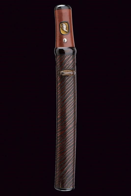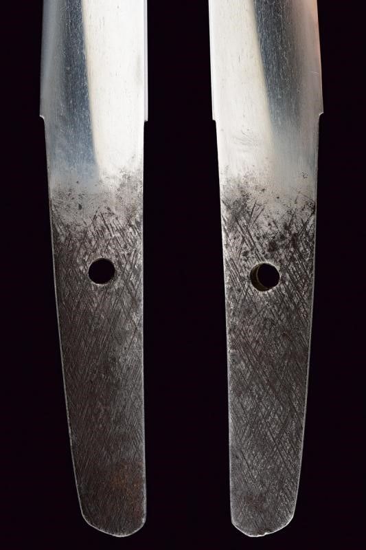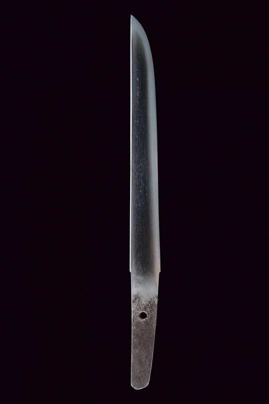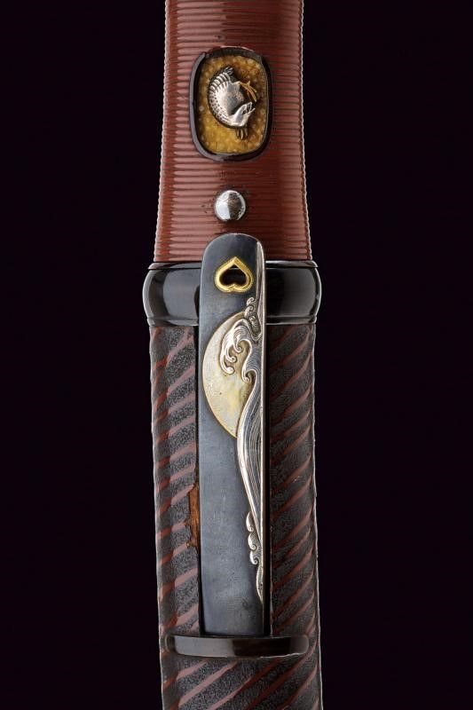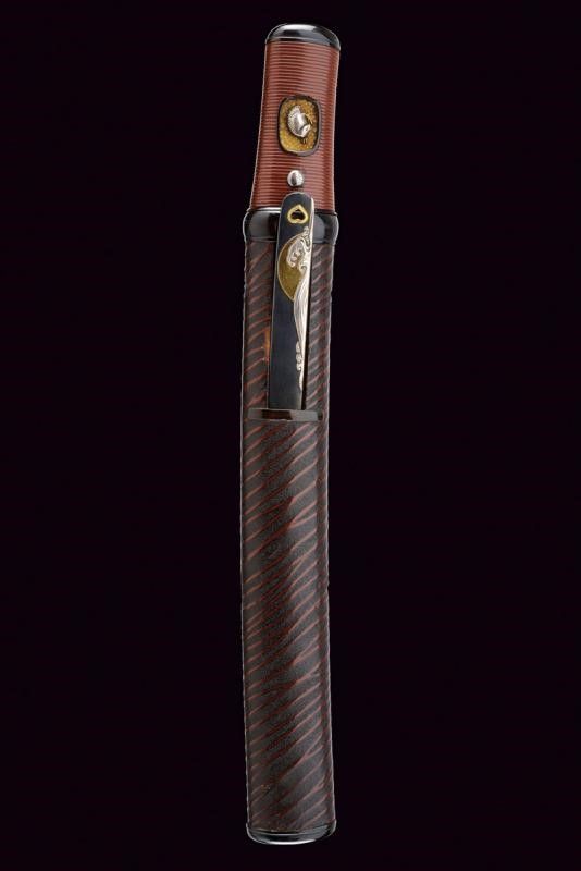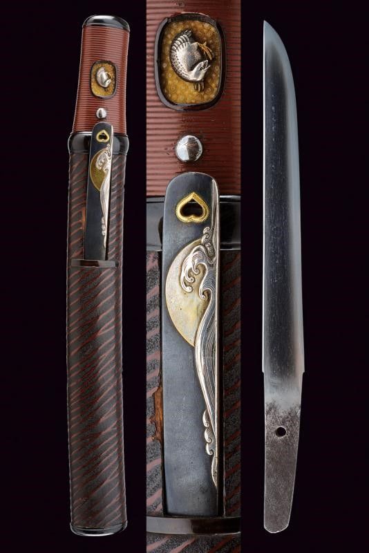 lunghezza 31 cm. Periodo Edo (1603-1867) Lama con nagasa di 20.9 cm; hamon: suguha hotsure; hada: mokume con masame hada verso l'area shinogi; boshi: ko maru. Nagako con un mekugi-ana, higaki yasuri. Habaki in argento. Bel koshirae con menuki a forma di quaglia in argento e ottone, saya in lacca rosa e nera con fornimenti in corno. Bella kozuka in shibuichi con onde in argento e sole in oro su fondo nero, occhiello di cinghiale foderato in oro, ko gatana mei: Sanami Kanetaka.