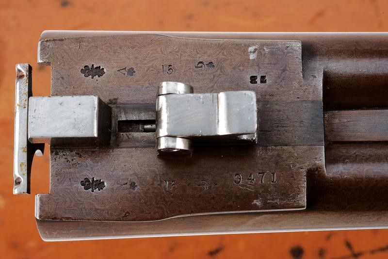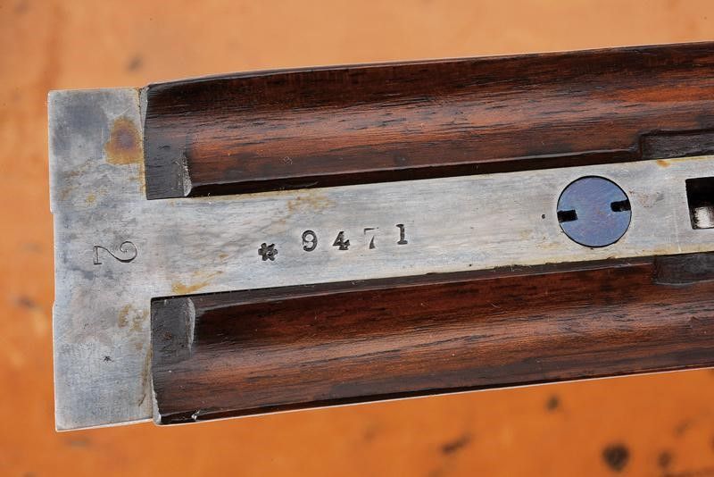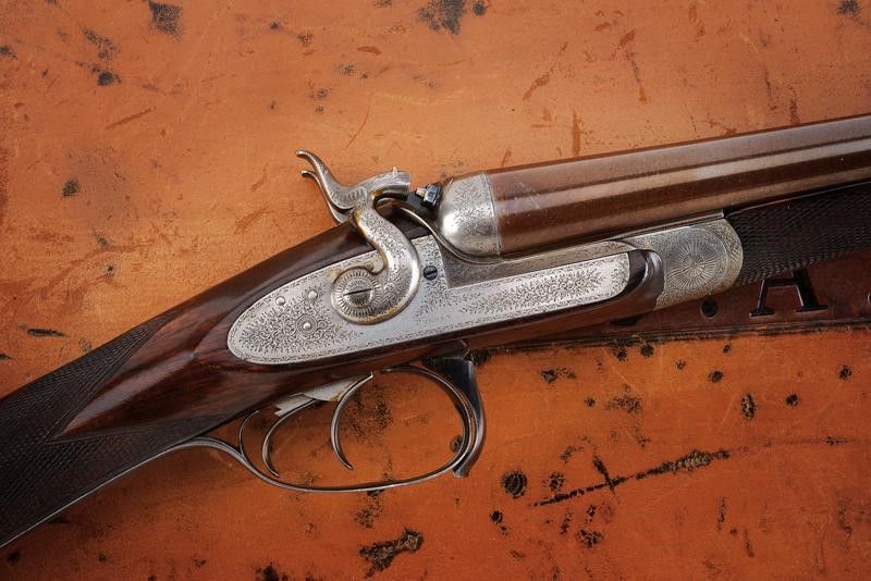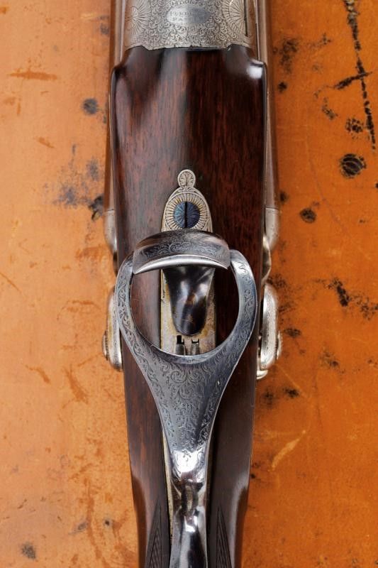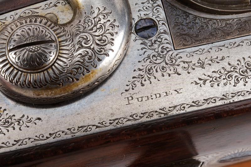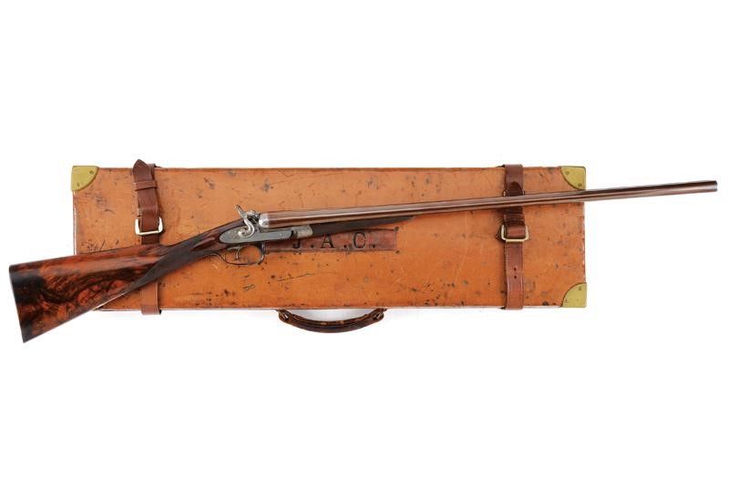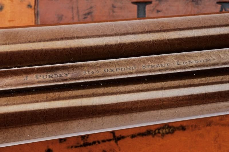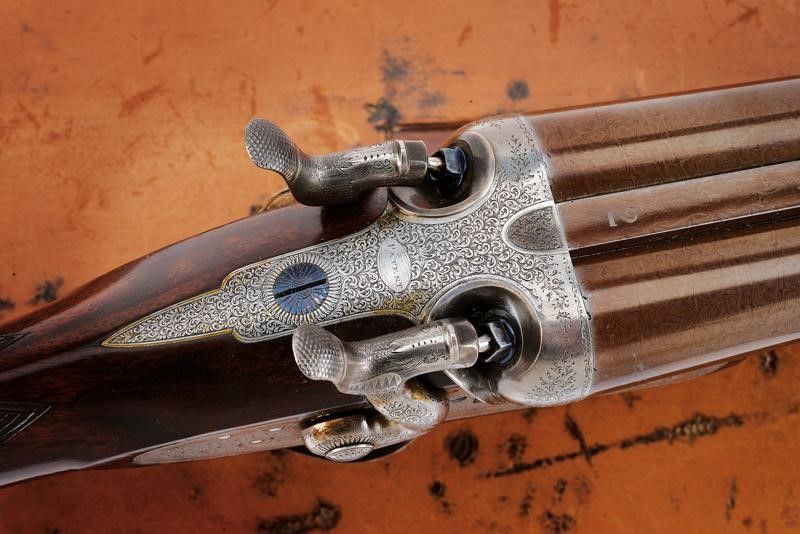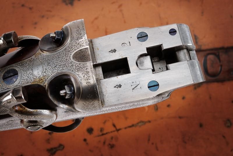 Canne tonde lisce, cal. 16, in fine damasco, dotate di bindella recante la firma 'J. PURDEY 314 1/2 OXFORD STREET LONDON', con mirino in argento. La bindella con il numero '2' in culatta. L'anima ben conservata, a specchio, con minimi segni all'interno (forse solo polvere). Nella parte inferiore timbri del banco di prova di Londra, numeri di serie e '15'. Bella brunitura color marrone (più tarda?). Bascula finemente incisa a racemi, anche questa marcata 'N.2' e punzonata a Londra. Il codolo dorsale marcato 'PATENT'. Il lato inferiore 'PURDEY'S PATENT'. Batterie con cani esterni a rimbalzo, anche queste finemente incise a racemi, ben funzionanti e firmate 'PURDEY'. La chiave con apertura a leva di forma palmata posta davanti al ponticello. Questa, come anche il ponticello stesso e il suo codolo con resti di brunitura color blu. Matricola coeva su canne, codolo del ponticello e croce (anche questa con n.2). Calcio ed astina in legno marezzato, entrambi con segmenti finemente zigrinati. L'astina con lieve mancanza e piccoli restauri. La pala recante scudetto d'argento sul lato inferiore con dicitura 'COUNT HESPEL' sormontata da corona comitale e soprastante la data '1875'. Il calciolo sempre in lamina di legno. In una cassetta da viaggio non coeva ma dell'epoca, con struttura in legno rivestita in pelle e lavorata a valigetta. Con fodera antica in panno rosso. Dotata di alcuni accessori.