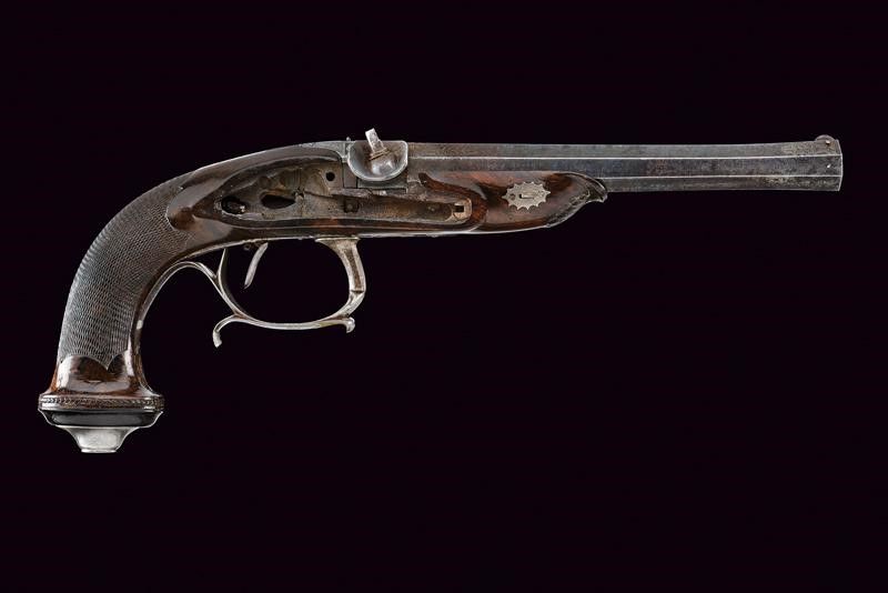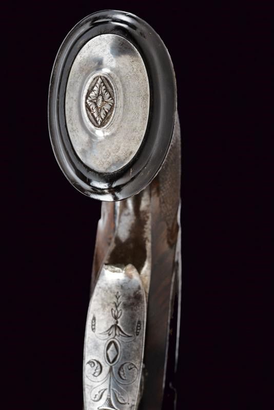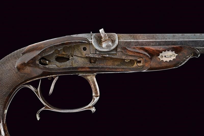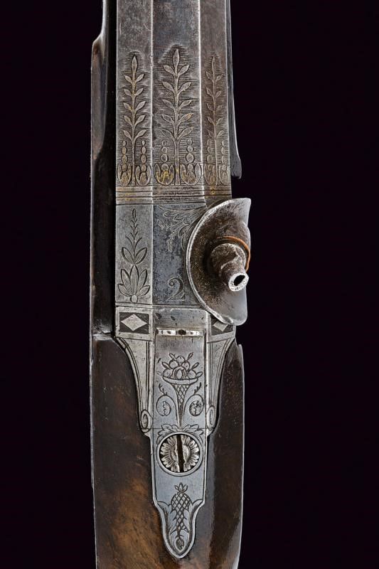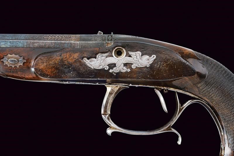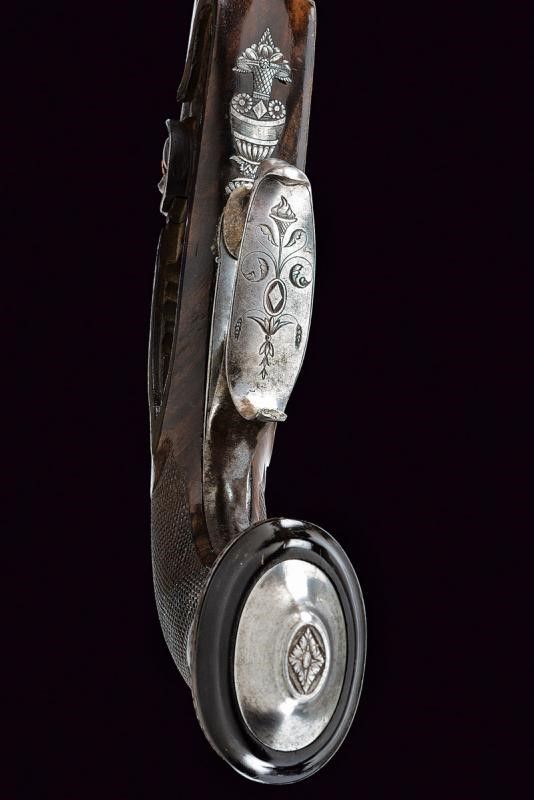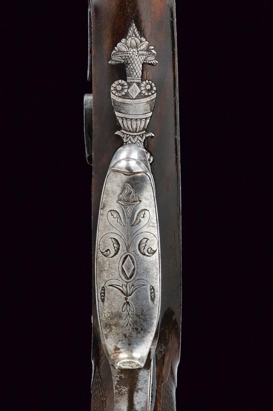 lunghezza 36.5 cm. Bella canna micro-rigata, brunita, con finissimi intagli floreali alle estremità; la culatta marcata '2', il mirino con resti di doratura, la volatta cal. 14 mm. Codetta incisa e munita di traguardo. La batteria mancante. Cassa a tre quarti in legno, con collo zigrinato e muso scolpito con una palmetta. Fornimenti in acciaio, la contropiastra intagliata ed incisa con due draghi intrecciati, il ponticello inciso a motivi floreali (rottura al poggiadito). Grilletto con stecher. Sicuramente parte di una coppia di pistole da cassetta di alta qualità.