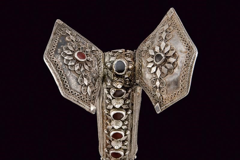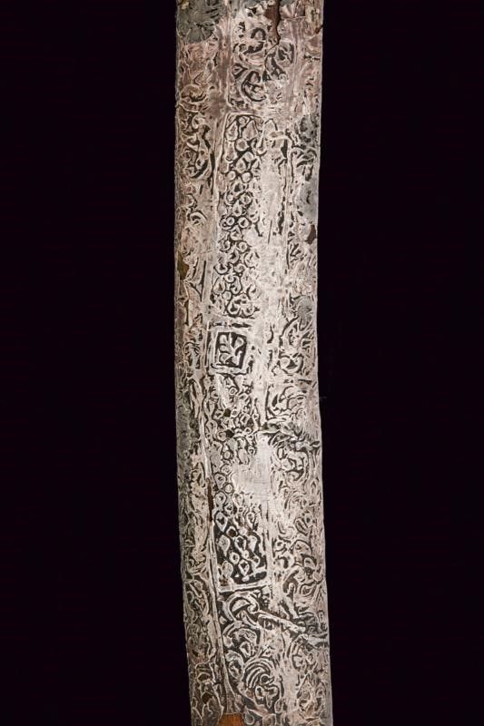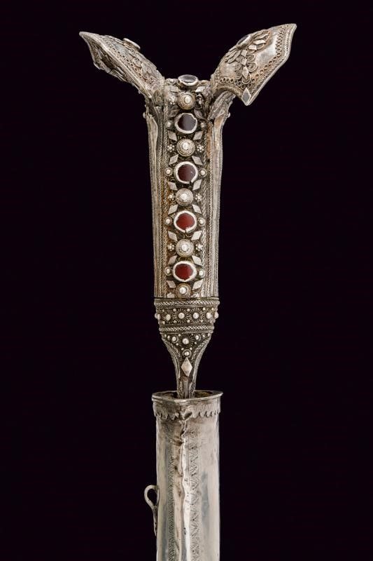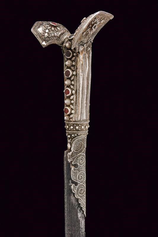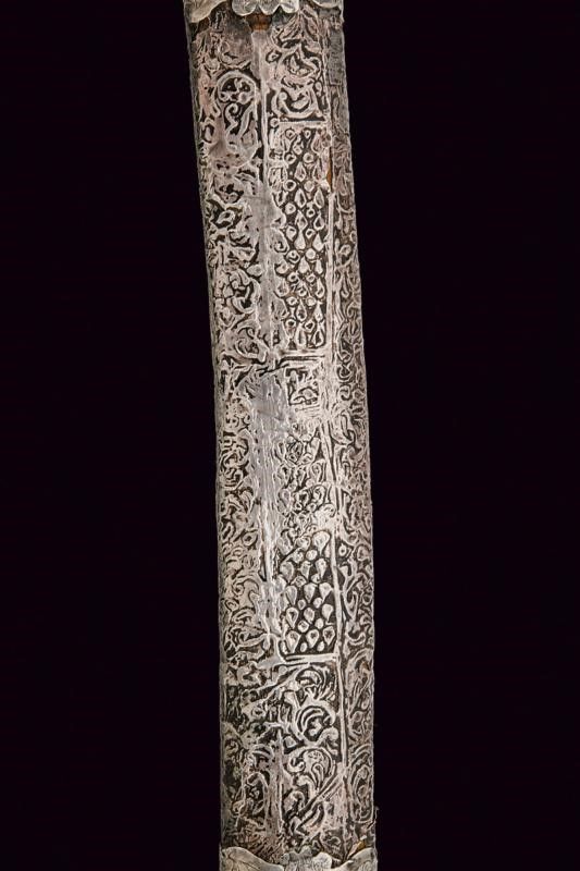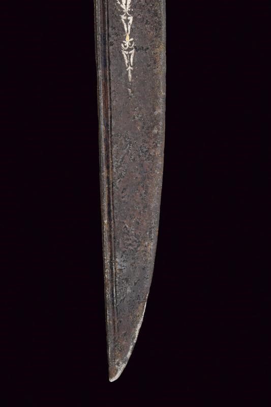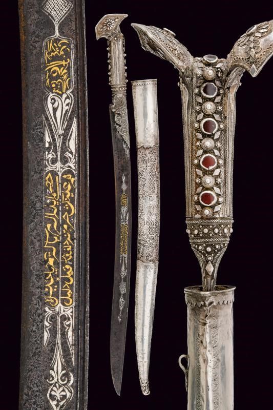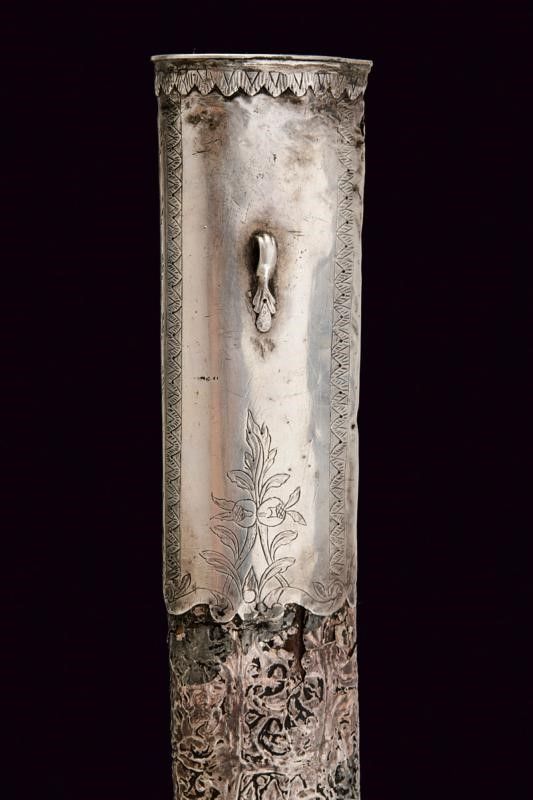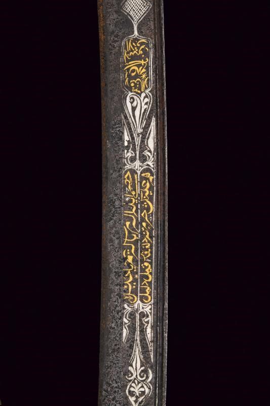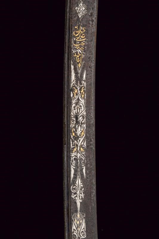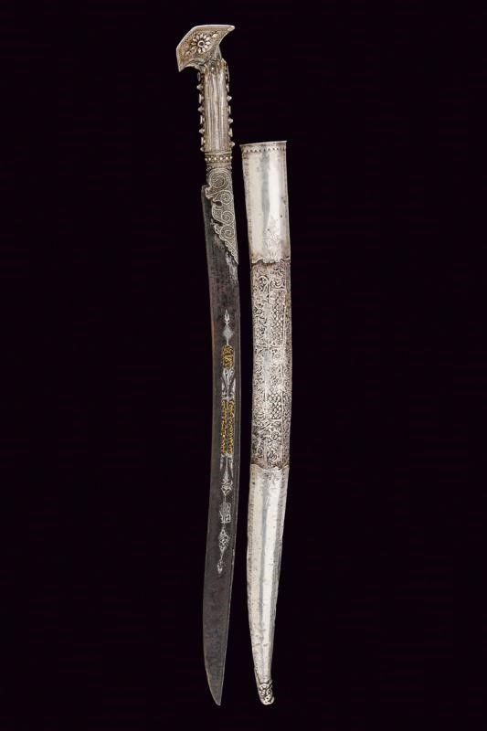 lunghezza 78,8 cm. Fine XVIII inizio XIX Secolo Lama lievemente incurva, con sottile sguscio accanto al dorso, ageminata in argento e oro su entrambe le facce. Il lato di quarta con iscrizioni in caratteri arabi e decori floreali, su quello di terza, una breve iscrizione e svariati fiorami e volute che occupano tutto il segmento centrale della faccia. La superficie è stata annerita. Intaccature. Il fornimento in argento finemente lavorato in filigrana. La tipica ghiera di ritenzione al forte con ampie spirali che racchiudono una fitta trama in filigrana. L'anellatura al collo con decori sempre in argento elaborati ad imitare perle e fiori. L'impugnatura con bande longitudinali lisce ed ad intreccio. Il dorso con cabochon di colore rosso bruno e un elemento niellato. Le orecchie (restauri e riparazioni alla base) piuttosto ampie e decorate con fiorami in rilievo realizzati in filigrana. Il fodero con segni d'uso e del tempo, in legno completamente rivestito di lamina d'ragento. Puntale e cappa lisci e arricchiti da cornicette, bande decorative e fiori. Il segmento centrale con sottile lamina d'argento (mancanze) recante decorazioni floreali impresse. Passante alla cappa, al puntale tipica testa di mostro. Di qualità.