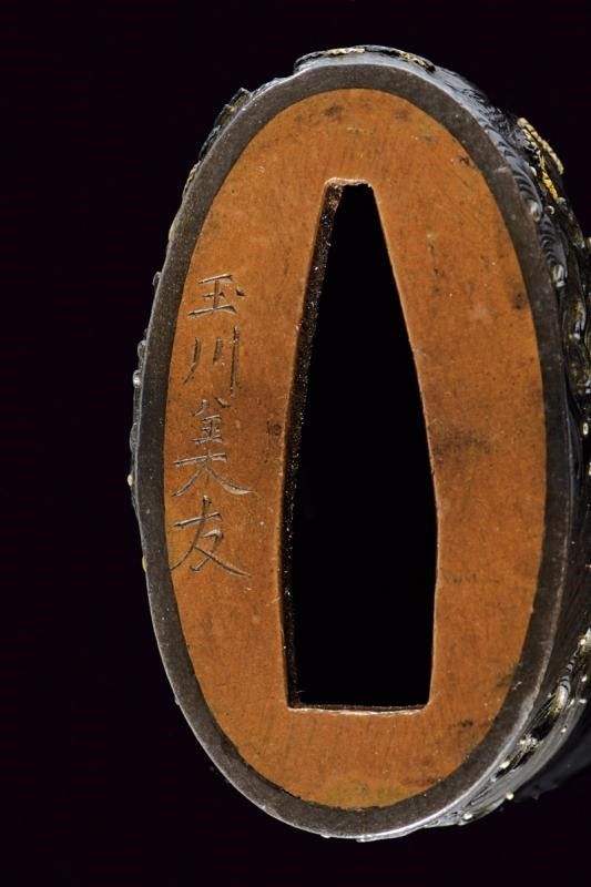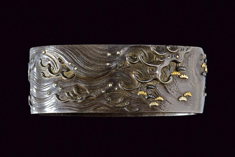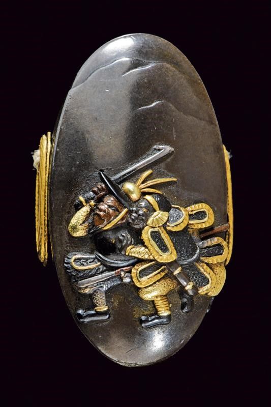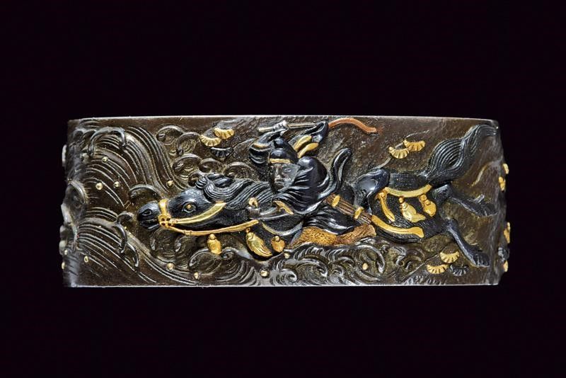 Periodo Edo (1603-1867) I due elementi lavorati en suite, in shakudo e shibuici. Il fuchi con bellissima effige realizzata in rilievo di un cavallerizzo che frusta la sua cavalcatura incitandola a lanciarsi fra le onde del mare in tempesta. Il gruppo scultoreo centrale ben rilevato e brunito con ricchi elementi dorati, quali le briglie e la bardatura del cavallo e i dettagli della veste del cavaliere, altri elementi quali le gocce d'acqua in argento a fare contrasto con la patina scura del mare in tempesta, anche questo intagliato con maestria. Mei: Mitomo Tamagawa. Il kashira di eguale bellezza con l'effige di due guerrieri in rilievo, dai volti grotteschi, uno brunito, uno in rame, e anche questi con dettagli in argento e oro, sullo sfondo una montagna. Apertura per la lama 2,5 cm. Conservati in kiri-box.