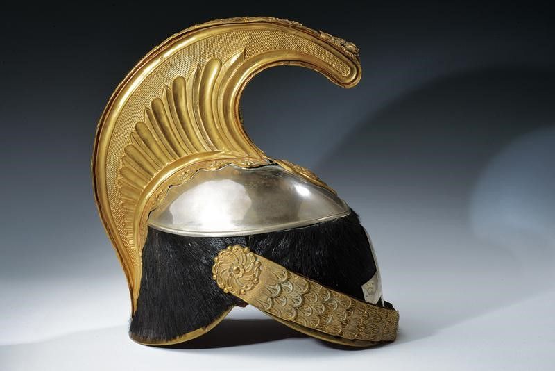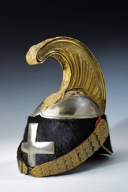 altezza 29.5 cm. primo quarto del XX Sec. Coppo in metallo bianco, con turbante in pelliccia nera, fregio frontale a croce in argento; soggoli in cuoio corazzati con scaglie in ottone; cimiero in ottone con decorazioni in bassorilievo a trofei e foglie, testa di leone e con placca recante il monogramma 'VE' coronato e fra allori; coccardina in stoffa con tricolore. All'interno fascia in alluda. Periodo di Vittorio Emanuele III. Di taglia molto piccola.