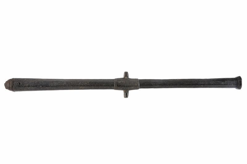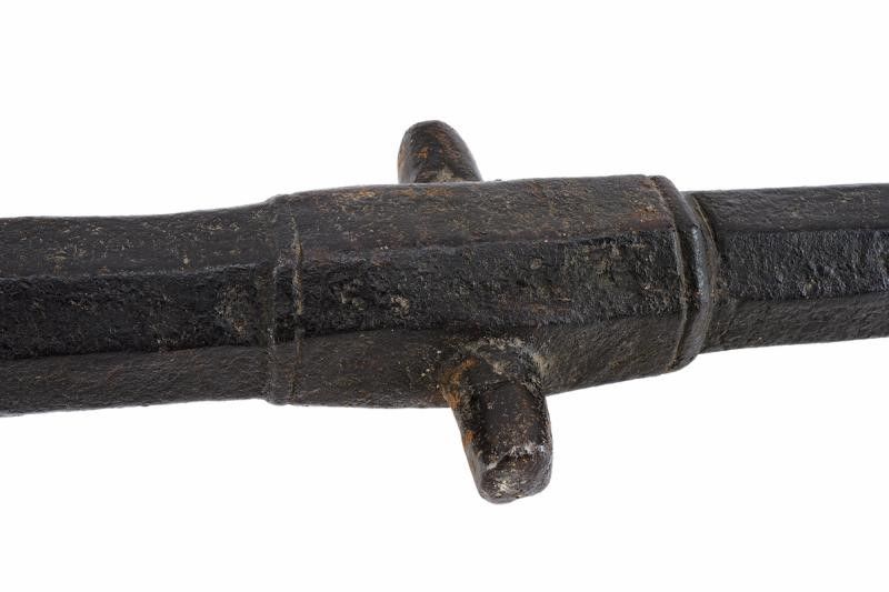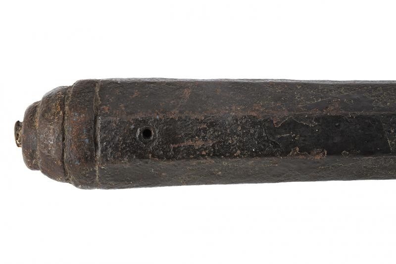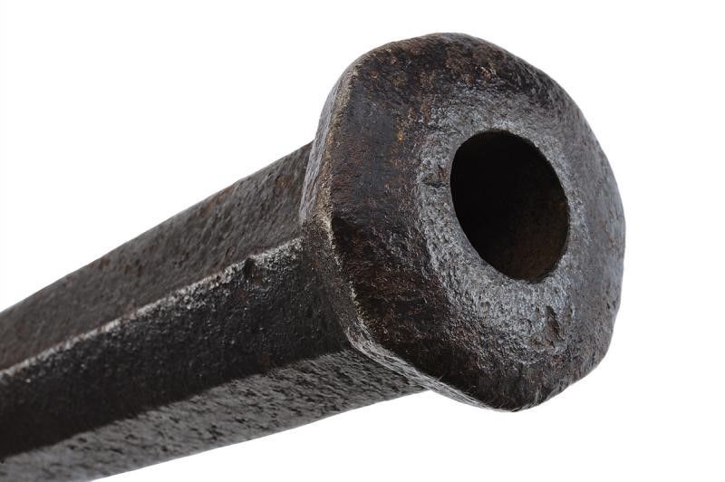 In ferro a tre ordini, tutti faccettati, il segmento centrale ingrossato e munito di orecchioni cilindrici. La base con culatta ad anelli e focone. La volata a connoncino, cal. 24 mm. Raro.