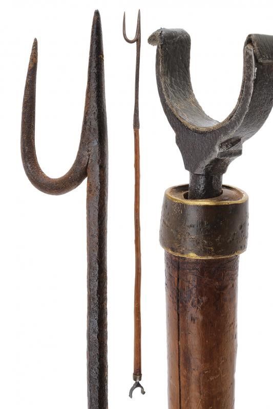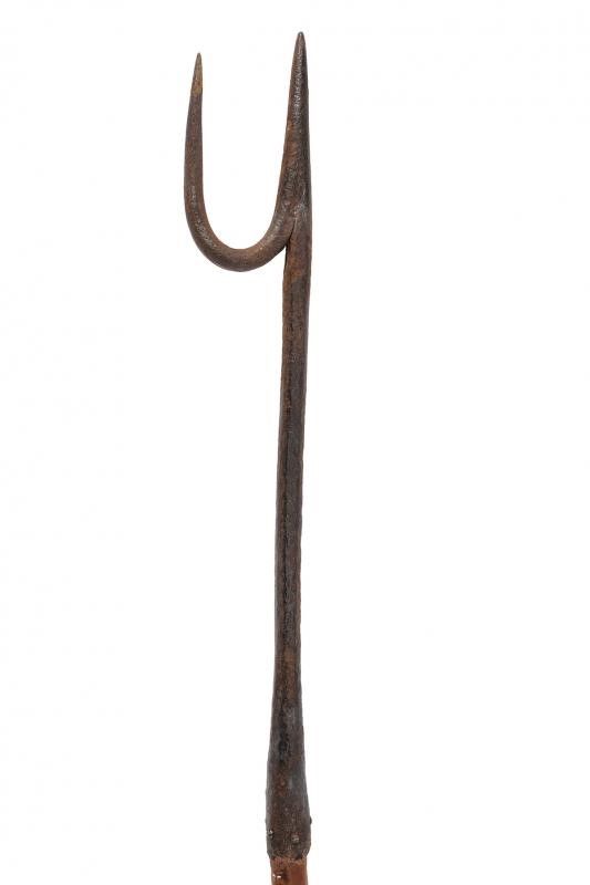In ferro con gorbia in ottone, fusto ligneo, la base in ferro appuntita e con gancio a 'U'.
