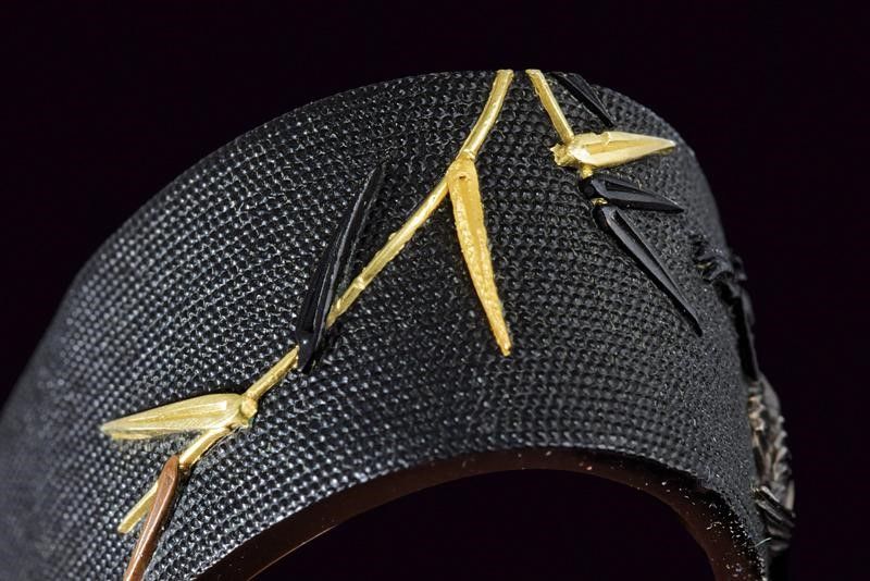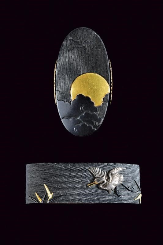 altezza 3,2 - 3,7 cm. Periodo Edo (1603-1867) Elegante e raffinato set di fornimenti lavorati en suite. In shakudo nanako. La superficie esterna finemente granulata. Il fuchi ornato in rilievo con effige di gru in volo e canne di bambù in rilievo, le figure arricchite in shibuichi e oro. Mei: Masanori Ishiguro. Il kashira con fondo lavorato en suite ed elegante effige della luna piena (anche questa dorata e con qualche lievissimo graffio) che fa capolino fra le nuvole. Apertura per la lama 2,7 cm. Epoca: probabilmente tardo Edo, XIX Sec. Conservati in kiri-box.