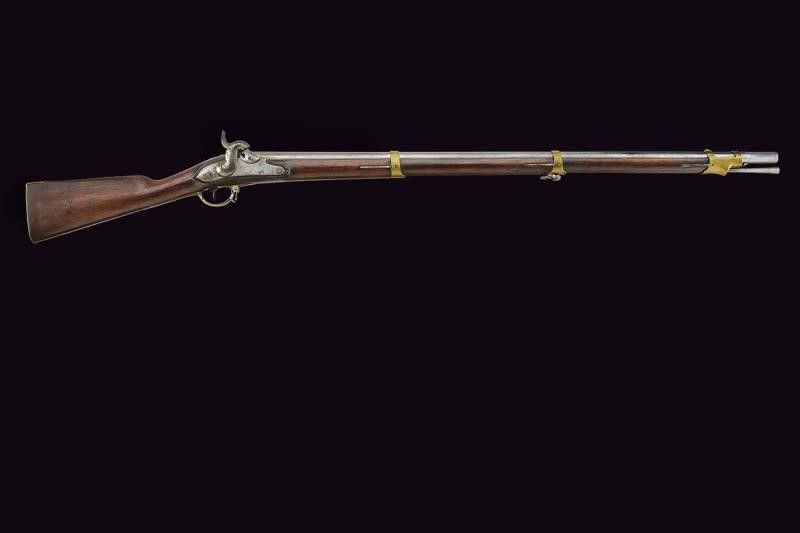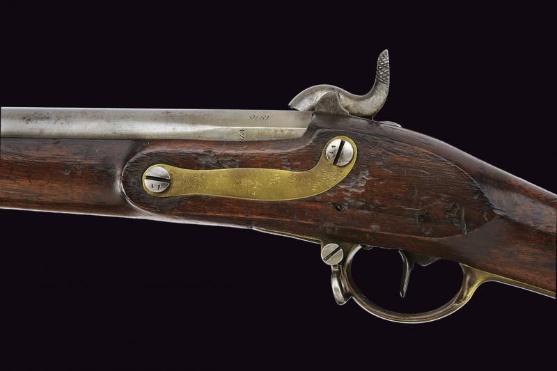 lunghezza 143,2 cm. Canna tonda liscia con culatta ottagonale datata '1816' e punzonata con 'S' coronata. Cal. 18,5 mm. in volata. Codolo con alzo fisso. Batteria convertita a luminello con resti di monogramma 'FW' coronato, soprastante iscrizione non chiaramente leggibile. Meccanica funzionante. Cassa intera in legno con timbri su entrambi i lati della pala. Fornimenti in ottone. Bacchetta in ferro. Bocchino con mirino.