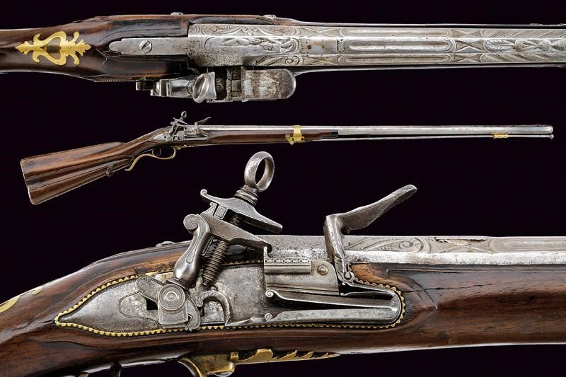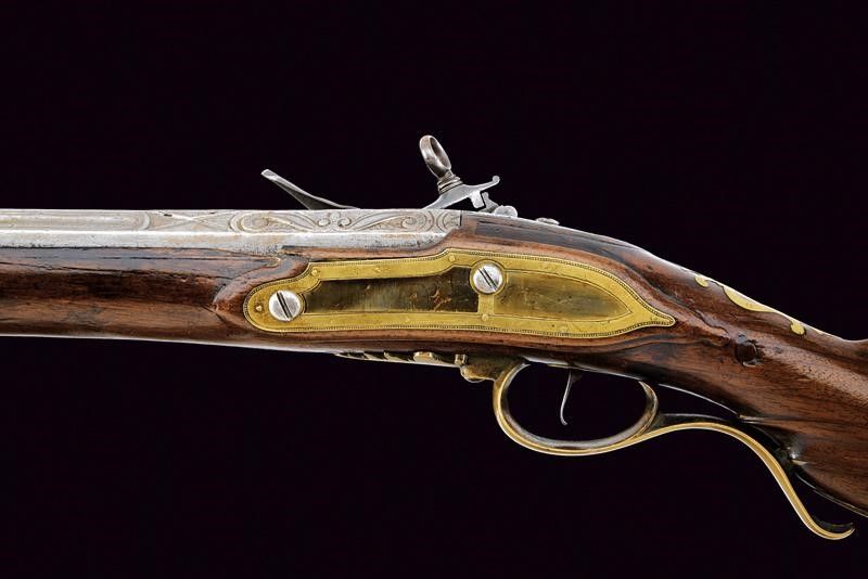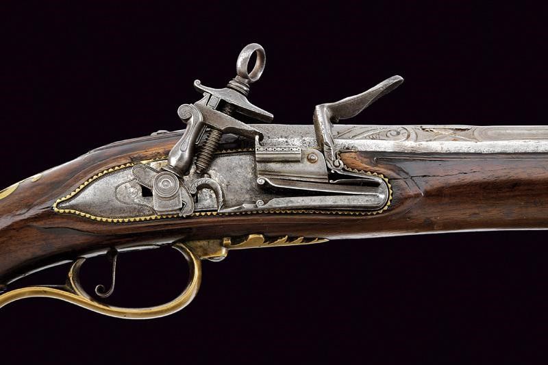 Canna liscia di sezione ottagonale (probabilmente di fattura più antica), totalmente intagliata ed incisa con un motivo a tre ordini che si ripete su tutta la lunghezza: il primo costituito da sgusci longitudinali, segue un disegno a 'X' (a rondine) ed infine figure antropomorfe incastonate tra losanghe, una parte delle incisioni e degli intagli impreziosita da agemine in argento (mancanze). Mirino ellittico in metallo e argento, volata con gioia di bocca accennata, cal. 16.3 mm. Batteria con cartella leggermente tondeggiante, incisione a campana dietro al cane, bordi delineati e puntinati; firmata all'interno 'A: Angeli'. Il perimetro della cartella racchiuso da una bordatura dentata in ottone (piccola mancanza). Mezza cassa in legno (crepe e piccoli difetti), con pala scolpita e dotata di due sgusciature. Fornimenti in ottone liscio, interessanti inserti in corno alla contropiastra, allo scudetto e al codolo del calciolo. Bocchino in corno. Bacchetta in ferro, il cavastracci lavorato a freccia.