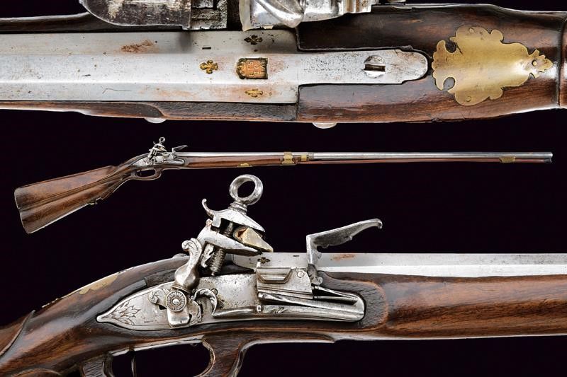 lunghezza 158 cm. Lunga canna liscia a due ordini; il primo segmento ottagonale avente alla base la marca 'PISTOIA' rimessa in ottone fra tre gigli (anche questi in ottone), il secondo segmento di sezione tonda con anellature al cambio, cal. 15.9 mm. Batteria a pietra con cartella piatta a bordi in parte delineati, la coda con fiore inciso; all'interno firma 'Nios 2 Il Guardiani'. Mezza cassa in legno (restauri al calcio e piccoli difetti generali); anche il ponticello in legno, alla cappuccina. Fornimenti lisci in ottone, monogramma 'V' sotto corona sulla fascetta reggicanna. Bacchetta in legno con battipalla in corno e cavastracci in ferro.