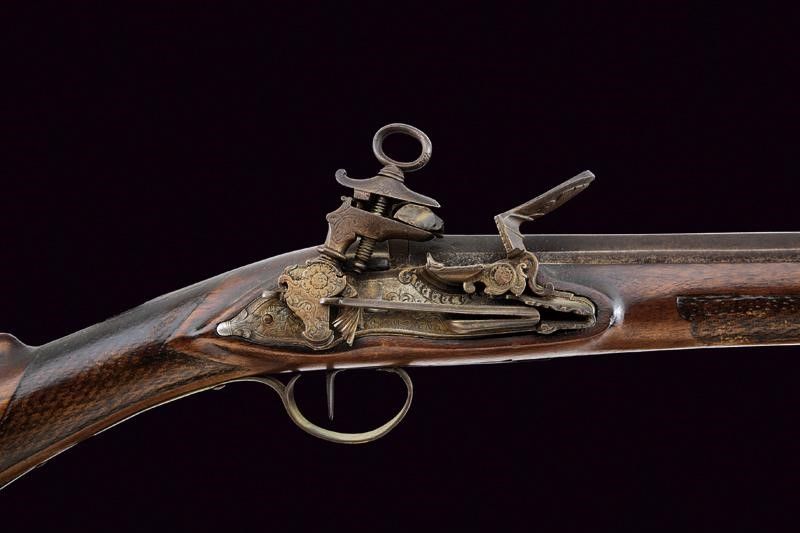 lunghezza 122 Canna liscia a due ordini, la prima parte ottagonale con marca 'DR' fra sei punzoni, dopo anellature diviene tonda, cal. 17.8 mm. Lunga codetta che riduce la sua sezione verso il calcio. Batteria alla micheletta firmata 'PIETRO CALCAGNO' ed incisa a trofei e motivi floreali. Cassa intera in legno con poggiamano e collo zigrinati, timbro 'U.D.' alla contropiastra. Bacchetta in ferro con battipalla in ottone. Meccanica ben funzionante.