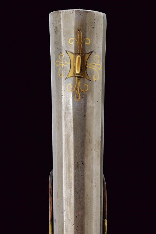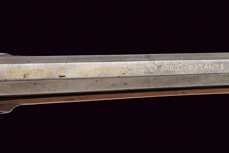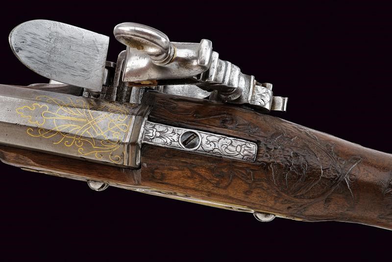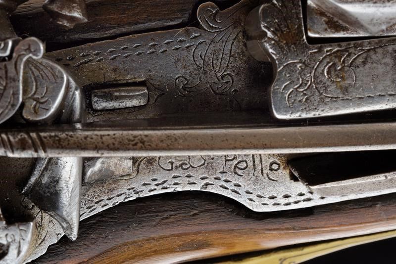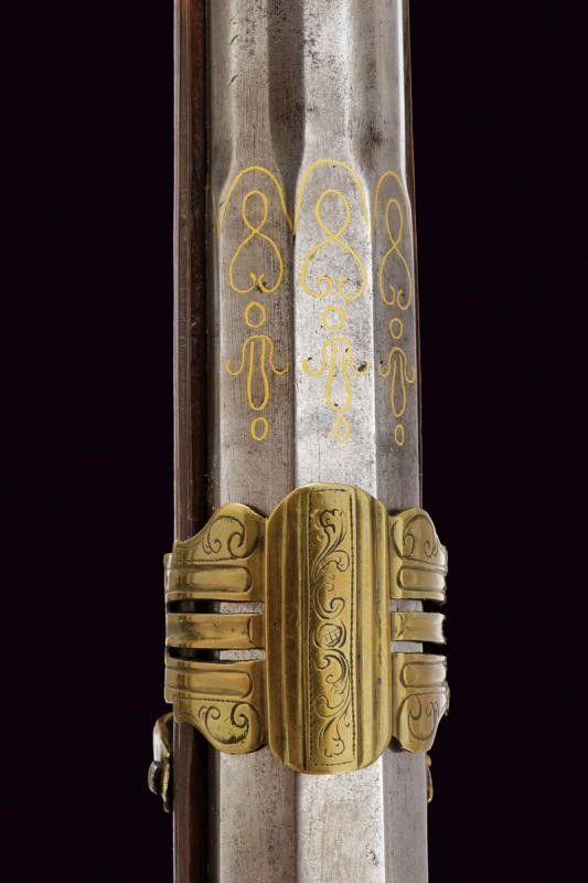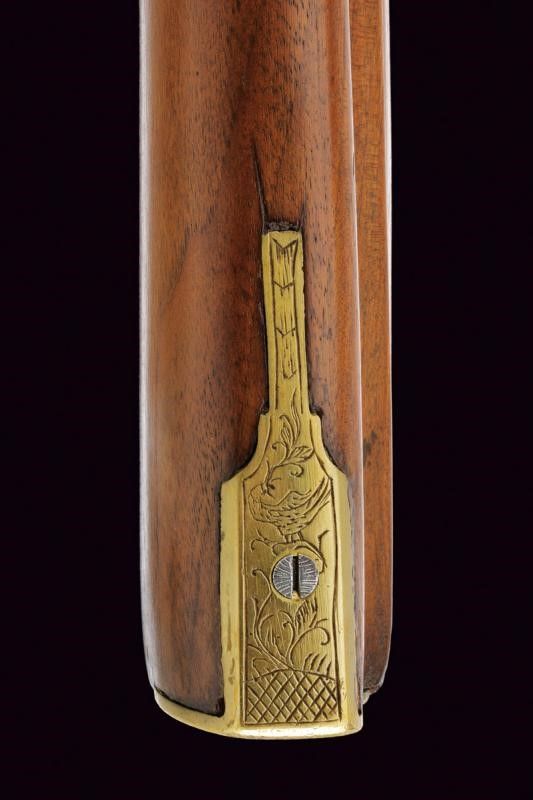 lunghezza 115.5 cm. Canna rigata, a due ordini, prima ottagonale, con cornice alla base, decorazioni in filigrana ed iscrizione rimessa in ottone 'CORAGGIO Á CHI MI PORTA IO LI SARO' COSTANTE', in seguito a sedici facce; il mirino in ottone decorato en suite, cal. 17 mm; codetta incisa. Tipica batteria alla micheletta riccamente incisa ed intagliata a motivi floreali e firmata 'Gas Pelle'. Cassa intera in legno, parzialmente intagliata a motivi floreali e con calcio scanalato. Bei fornimenti in ottone, incisi a motivi floreali. Bacchetta in ferro con battipalla in ottone.