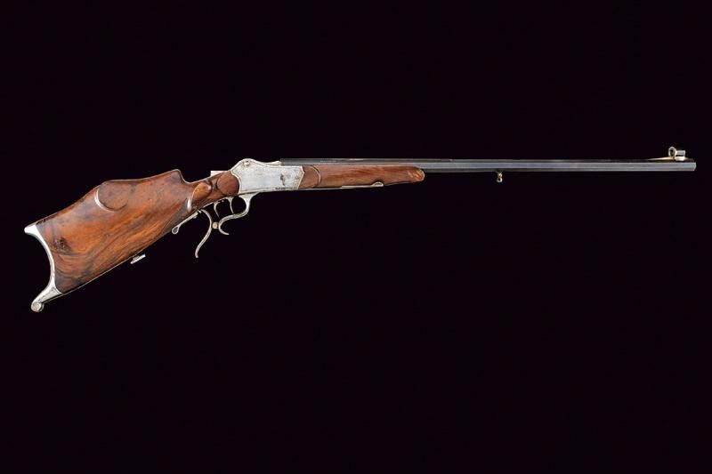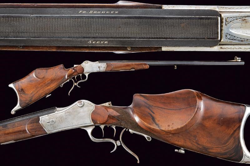 lunghezza 119 cm. Pesante canna rigata (anima pulita, rigatura visibile), ottagonale, bindella zigrinata, brunita, marcata 'FR. BRODETZ STEYR', mirino di precisione, cal. 7.5 mm. Castello in ferro con otturatore tipo Martini e decorato con ghirlanda incisa ai bordi. Fornimenti in ferro. Stecher. Meccanica funzionate.