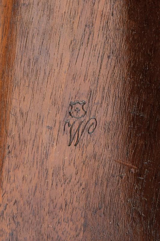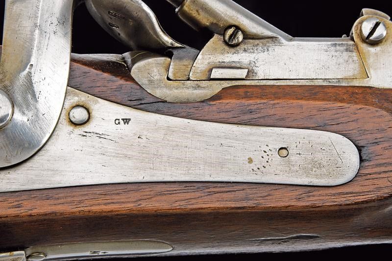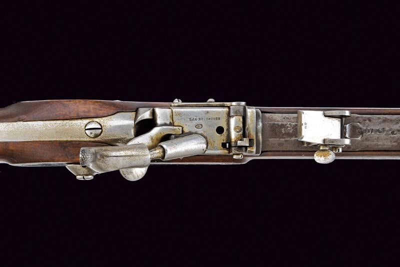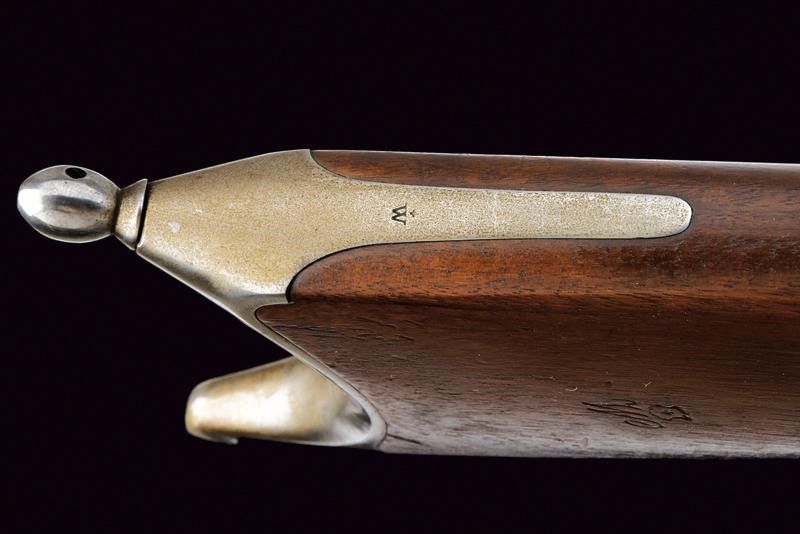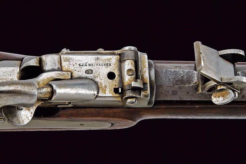 lunghezza 126 cm. Canna tonda rigata (anima con pitting, rigatura visibile) dotata di mirino, alzo regolabile, culatta ottagonale con vari punzoni svizzeri e matricola '102', cal. 10.4 mm. Otturatore ribaltabile marcato 'S. J. G NEUHAUSEN' e punzone 'V' sotto croce elvetica. Batteria a molla in avanti marcata 'GW'. Meccanica funzionante. Cassa lunga in legno, varie marcature e matricola coeva. Fornimenti in ferro. Bacchetta in ferro. Stecher ben funzionante.