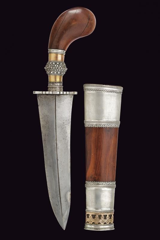 Mindanao, lunghezza 27.8 cm. inizio del XX Sec. Robusta e larga lama a due fili con sottile scanalatura centrale; impugnatura in legno con ghiera in argento lavorata a motivi geometrici in filigrana e elso intagliato e dotato di bordo decorato a tacche. Fodero in legno con fornimenti in argento parzialmente dorati, decorati a bande incise e parzialmente traforati. Sul lato posteriore un passante lavorato a fogliame.