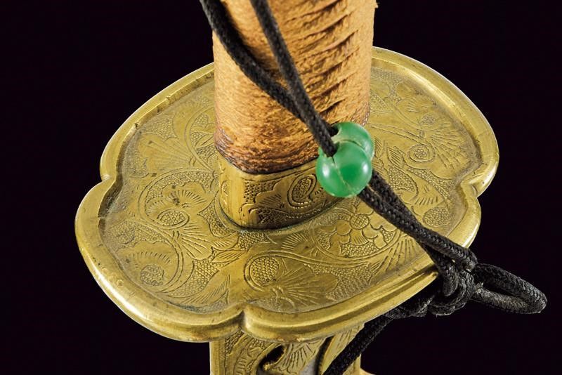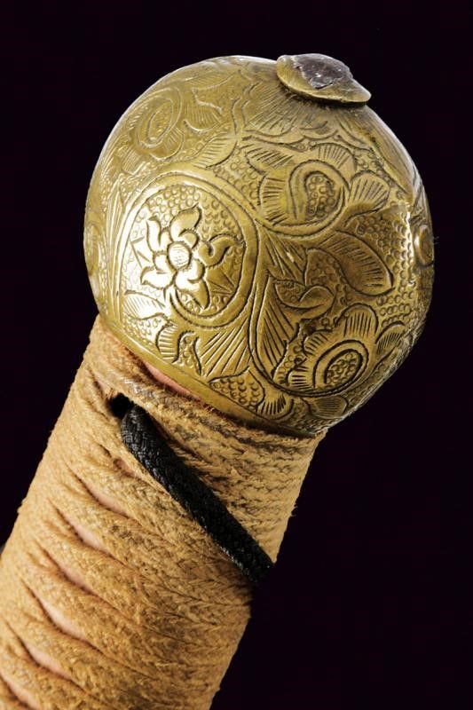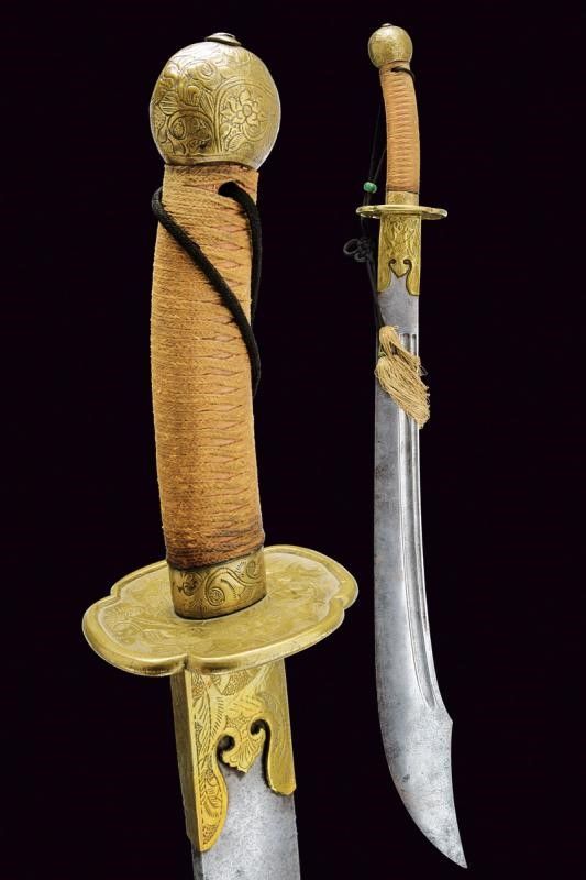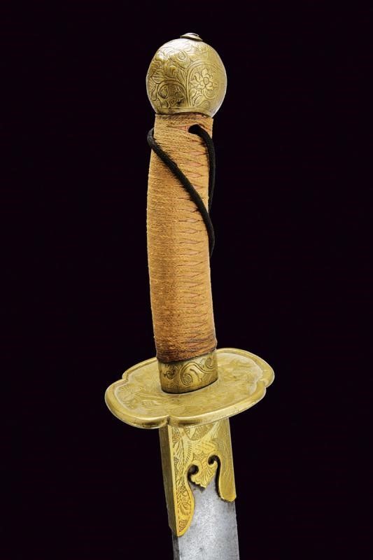 lunghezza 94 cm. Lama leggermente curva a un filo, di forma crescente verso il debole e munita di due scanalature accanto al dorso, la base rivestita con lamina d'ottone incisa a motivi floreali. Elso di forma lobata in ottone decorato en suite. Impugnatura in legno rivestita con bande in tessuto e munita di sforatura centrale (per nappa 'jiànsuì' in tessuto) con pomo e ghiera in ottone decorati nello stesso modo.