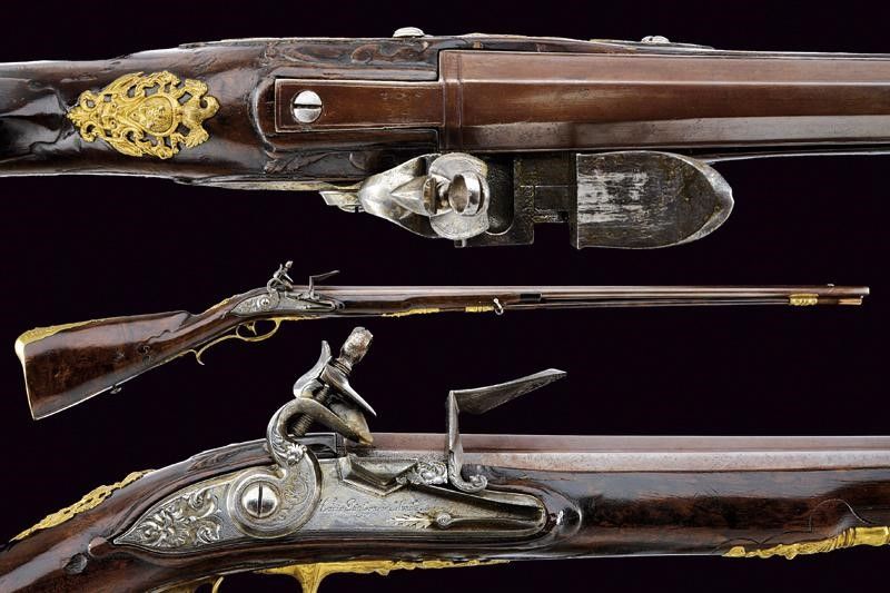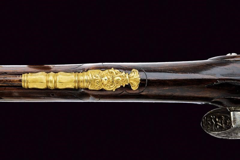 lunghezza 136 cm. Canna liscia a due ordini, priva di anellature, prima ottagonale e poi tonda, ribrunita, con sottile bindella che culmina in un mirino, cal. 15 mm. in volata. Codetta delineata ai bordi. Bella batteria a pietra focaia firmata 'Henric Janssen in Münche.' finemente intagliata con mascheroni in bassorilievo, il cane inciso anche a motivi floreali. Mezza cassa in radica leggermente scolpita (alcuni restauri nella parte anteriore) con bellissimi fornimenti in bronzo dorato. La contropiastra traforata ed incisa con cervo entro un fiorame. Ponticello con guerriero e mascherone. Coccia con grande mascherone fra decori floreali. Dorso recante scudetto con busto e mascherone sotto ad un gallo. bacchetta in legno con battipalla in corno e cavatrici in metallo.