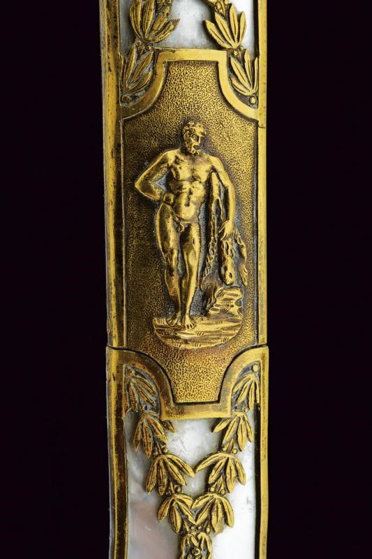Primo Impero Lama dritta a due fili (varie piccole intaccature e zone con danni da ruggine), la prima parte con resti di incisioni dorate a motivi floreali. Bel fornimento in bronzo, il massello con alette fermafodero decorate con nike alata; bracci dell'elso dritti, faccettati e decorati a volute in bassorilievo, le estremità a testa di leone. Pomo a elmo chiuso. Guancette in madreperla (mancanza a quella posteriore) decorate a scanalature longitudinali. Bellissimo fodero in legno rivestito in madreperla e con fornimenti in ottone, la cappa con un guerriero all'antica, la fascia centrale con un'immagine di Eracle, le due finestre con ghirlande di alloro su fondo in madreperla, il puntale a motivi floreali. Il lato posteriore decorato a motivi floreali, la cappa con monogramma 'FP'. Sul bordo destro del fodero si trova la marcatura 'Fatou Rue du Bac a Paris'. Due anelli fissi di sospensione. La vela traforata.