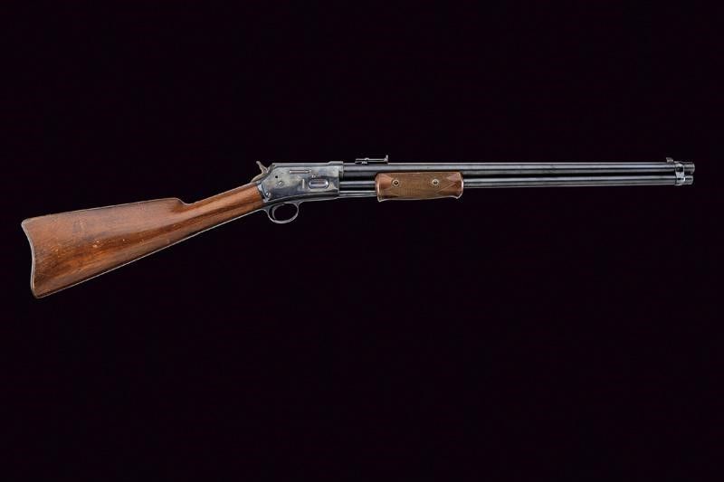 USA, lunghezza 94 cm. 1887 Canna tonda rigata da 20', recante marcatura in due righe con indirizzo della ditta di Hartford e fra croci i brevetti fino al 1883 preceduti da 'ELLIOT'S PATENT', dotata di mirino ed alzo regolabile ed abbattibile, con marcatura del calibro sul fianco '32 Cal.' (probabilmente 32-20). Meccanica funzionante. Castello con cavallino rampante della ditta ed anello da sella sul fianco sinistro. Calcio e astina in legno, la seconda zigrinata. Matricola nel codolo inferiore '73xxx'. Conserva circa il 75% della brunitura (probabilmente antica). Qualche intaccatura al calciolo. Presenta caratteristiche non comuni.