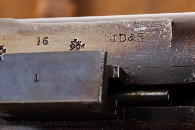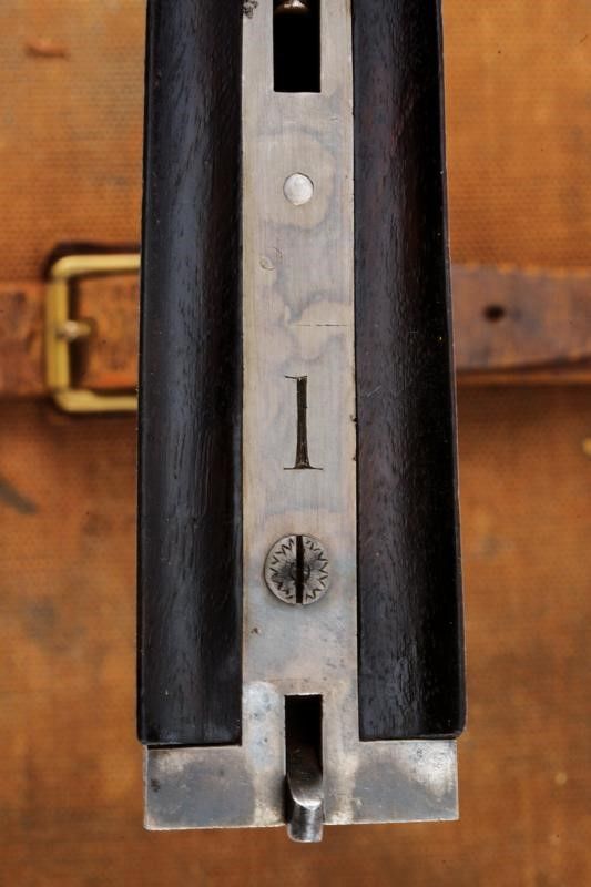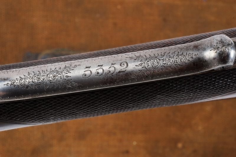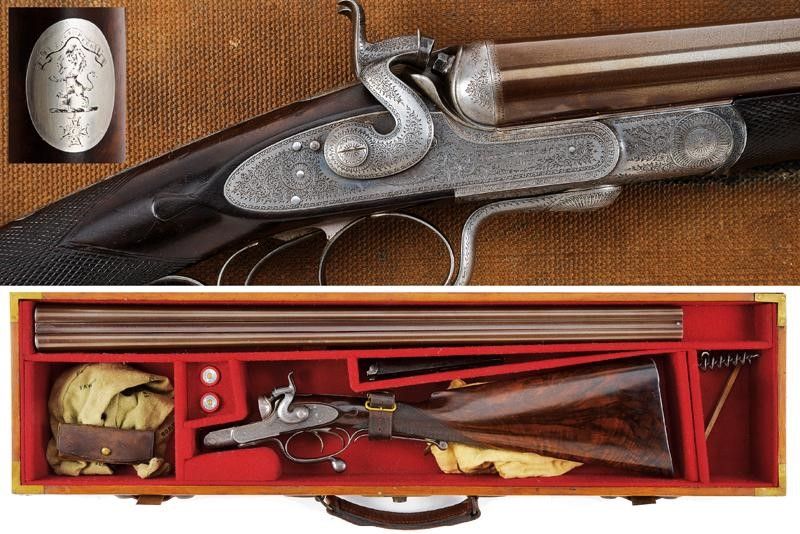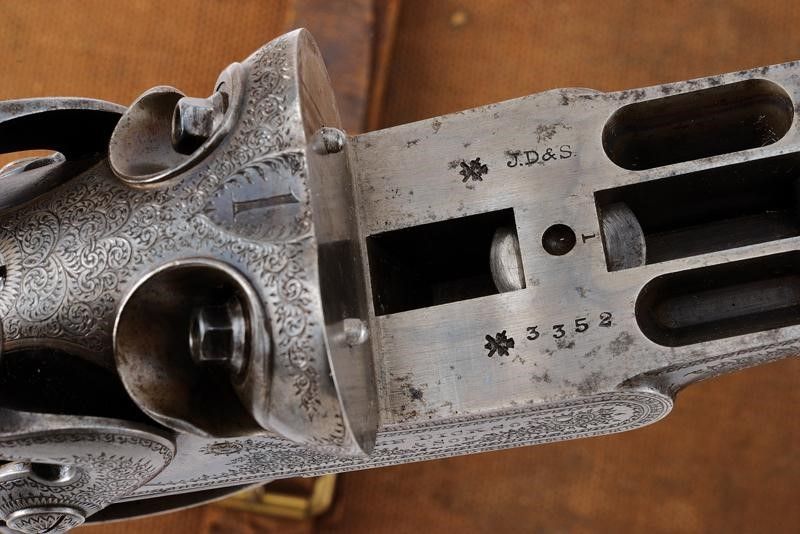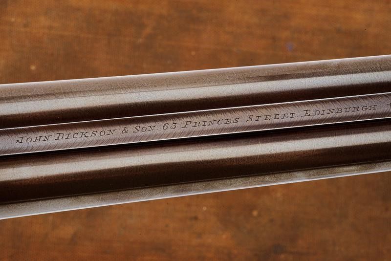 Canne lisce in damasco cal. 16, dotate di bindella recante marcatura 'JOHN DICKSON & SON 63 PRINCES STREET EDIMBURGH' e '1', munita di mirino in metallo bianco. Anche l'estrattore marcato '1'. Nella parte inferiore punzoni del banco di prova di Bimingham, marcatura '16', timbro 'J.D&S' e numerate. Anime a specchio, minimi segni alle camere di cartuccia. Bella brunitura marrone (rinfrescata?). Bascula finemente incisa a racemi e con segmenti incavati all'interno per alleggerire il peso, con marchi coevi alle canne e timbri sempre di Birmingham. Il codolo dorsale con piccolo traguardo a sella numerato '1'. La chiave con apertura a leva sottostante il ponticello. Batterie incise en suite e firmate 'JOHN DICKSON & SON', con cani a rimbalzo. Astina e calcio in bel legno marezzato, la prima completamente zigrinata e numerata '1' alla croce. Il secondo zigrinato al collo. Il calciolo in un unico pezzo con il calcio, rinforzato alle due estremità da placchette in ferro incise come le altre componenti. L'impugnatura con sicura a pressione al ponticello. Matricola coeva su canne e ponticello. Resti di finitura (tartarugata?) sulle parti in ferro. nella parte inferiore della pala uno scudetto in argento inciso, recante emblema di leone rampante sormontato dal cartiglio 'SANS PEUR' e soprastante l'effige di un ordine cavalleresco, probabilmente l'Ordine del Bagno. In una cassetta d'epoca ma non coeva, dotata di alcuni accessori, realizzata in legno ed elaborata a valigetta.