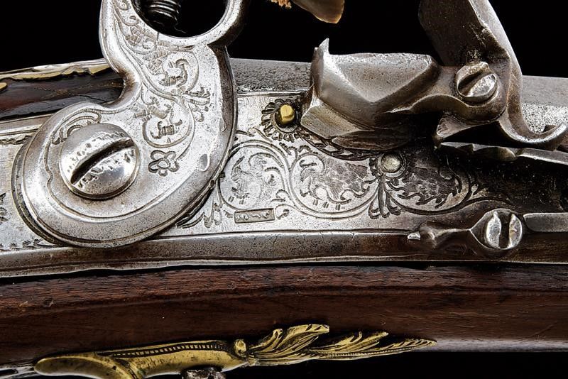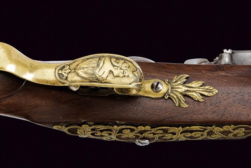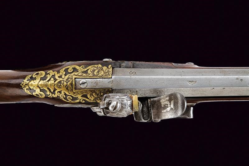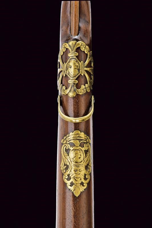 Canna rigata, a due ordini, prima ottagonale e marcata 'S', con grande punzone a mezzaluna, con alzo mancante, poi tonda con anellatura al cambio e con gioia di bocca alla volata (mirino mancante), il focone spostato in avanti. Cal. 16 mm. Batteria incisa a motivi floreali e munita di un punzone, modificata per la nuova posizione del focone. Mezza cassa in legno con calcio scanalato e bellissimi fornimenti in ottone; la contropiastra traforata a motivi floreali, il ponticello con busto, il fornimento superiore del calciolo a motivi floreali, quello inferiore con una divinità. I fornimenti attorno alla codetta, nell'astina e il reggicanna, tutti traforati e decorati a mascheroni, busti e figure grottesche. Bacchetta in legno con battipalla in corno.