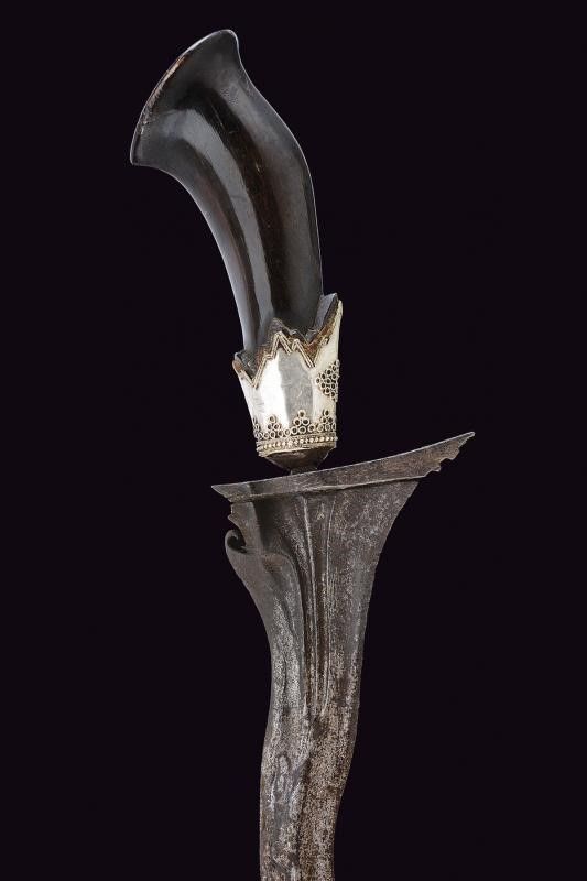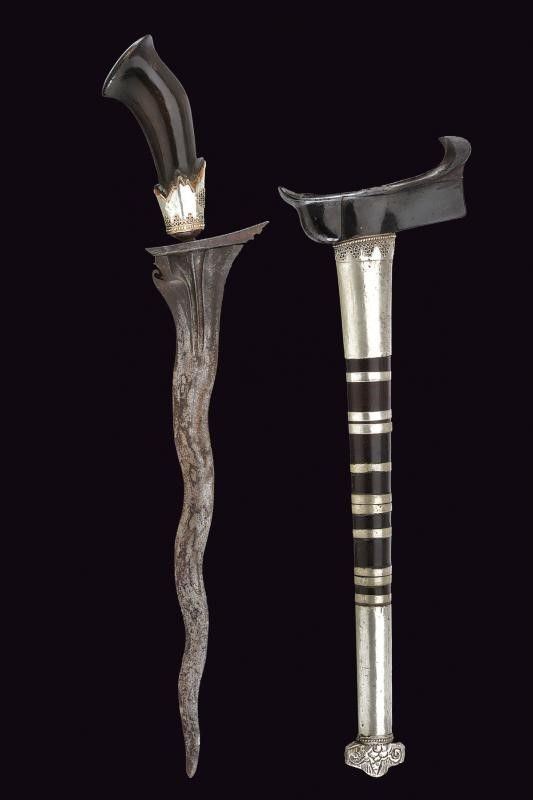 Giava, lunghezza 42 cm. XVIII/XIX Secolo Lama a due fili ondulati in pamor (del XVII secolo o più antica), scanalata ed intagliata al forte. Il fornimento e il fodero provenienti da Sumatra del Nord e databili al XIX secolo. Ukiran in corno scolpito (piccole mancanze) con selut in lamina d'argento decorata in filigrana. Wrangka e gandar in legno scuro con decorazioni in lamina d'argento, la cappa decorata en suite con il selut, il puntale inciso a motivi floreali.