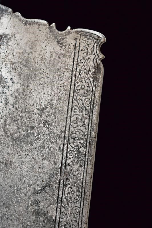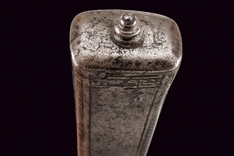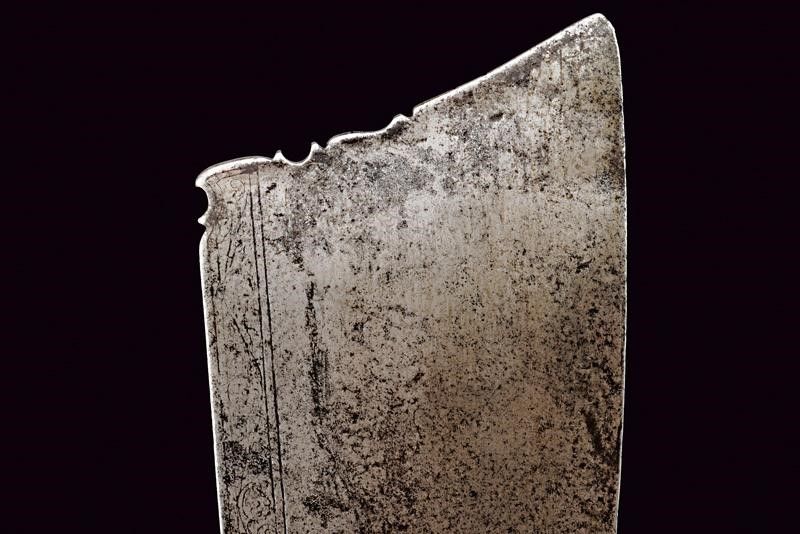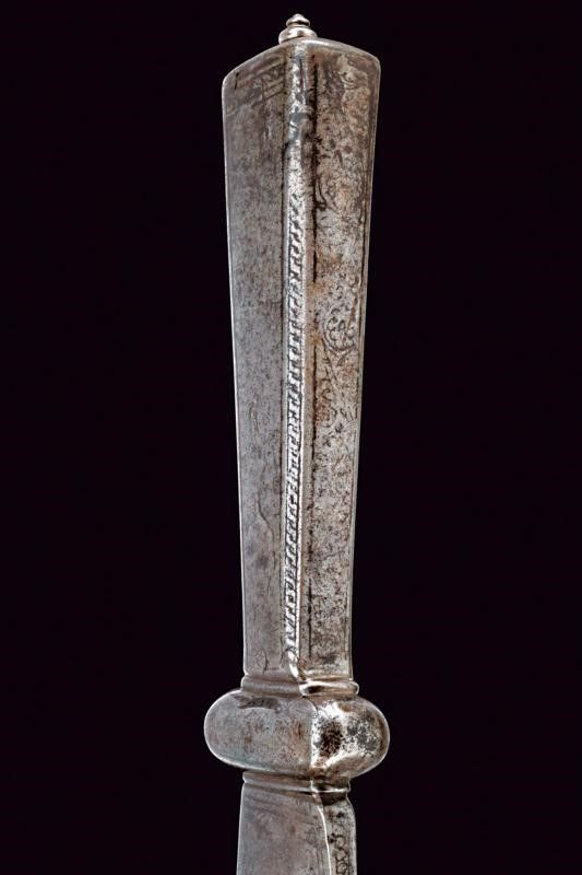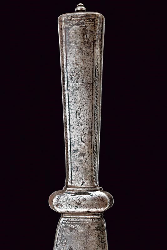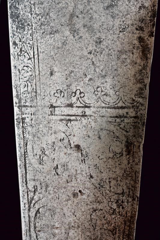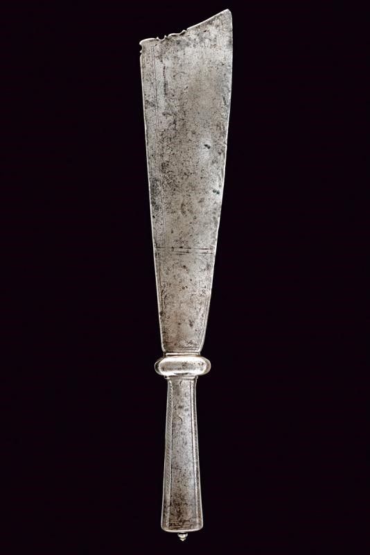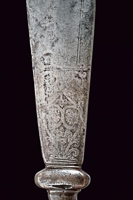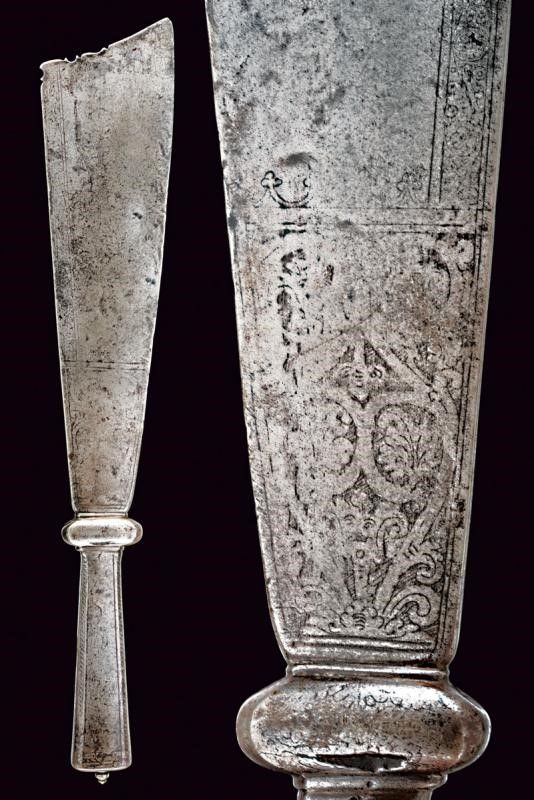 lunghezza 46.5 cm. Base del ferro di un falcione (circa un terzo della lunghezza originaria del ferro), a un filo, con larga punta non acuminata, obliqua, leggermente intagliata. La lama incisa al forte e lungo il dorso; la decorazione conservata meglio su un lato che sull'altro. Nodo a cuscino e gorbia ottagonale rastremata verso l'alto e munita di un coperchio con bottoncino a fungere da pomo. Il nodo inciso a motivi floreali, la gorbia a motivi geometrici.